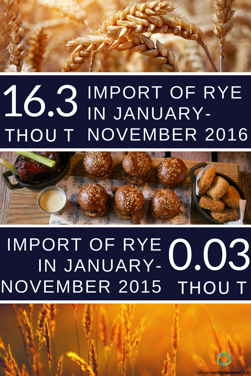 In January-November 2016 Ukraine imported a record amount of rye - 16.3 thousand tons that in monetary terms is USD 2.5 million. Whereas, for the same period previous year only 0.03 thousand tons of product amounting to USD 0.09 million were imported.