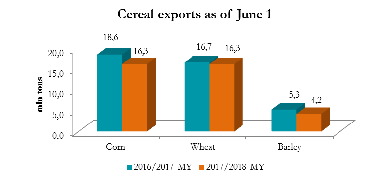 According to the Ministry of Agrarian Policy of Ukraine, as of June 1, from beginning of 2017/18 MY, Ukraine exported 37,56 mln tons of grain crops, that is 3,19 mln tons more than in the same period last year. Compared to last year the largest decrease is observed in exports of corn and barley. We are seeing a much better situation regarding wheat - as of June 1, 2018, Ukraine exported 99% of wheat volumes identified in the Memorandum of Understanding between the Ministry of Agrarian Policy and exporters. At present, 16,3 mln tons of wheat were shipped to foreign markets, of which 9,52 mln tons have food quality. The volumes of barley exports amounted to 4,2 mln tons, which is 1,05 mln tons less than as of June 1, 2017. This year 16,28 mln tons of corn were exported (-2.31 mln tons compared to last year's figure).