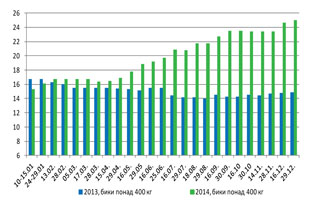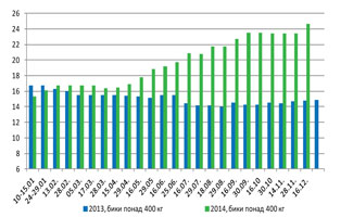 У першій половині грудня закупівельні ціни на ВРХ демонстрували тенденцію до зростання. Станом на 16 грудня биків 400+ закуповували за ціною 23,00-26,00 грн./кг (з ПДВ).