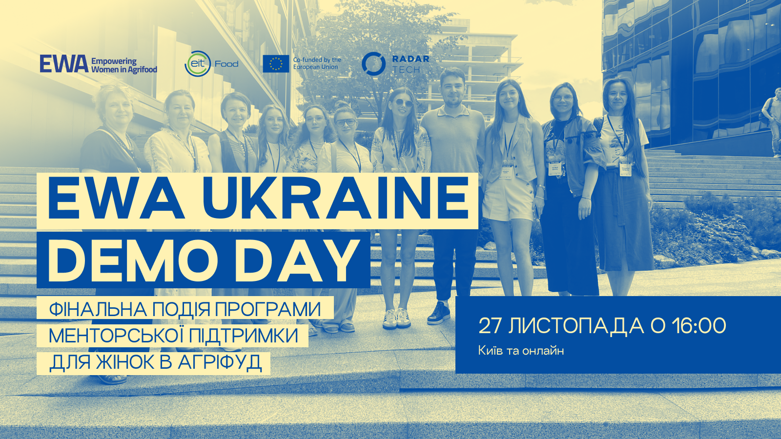 Демо День — фінальна подія в рамках програми EWA Ukraine — менторської підтримки для жінок з агропродовольчого сектору від EIT Food, що реалізовується Radar Tech. Під час події 10 учасниць презентуватимуть свої напрацювання інвесторам і журі. Найкращі проєкти отримають 10,000 євро та 5,000 євро на розвиток власної справи!