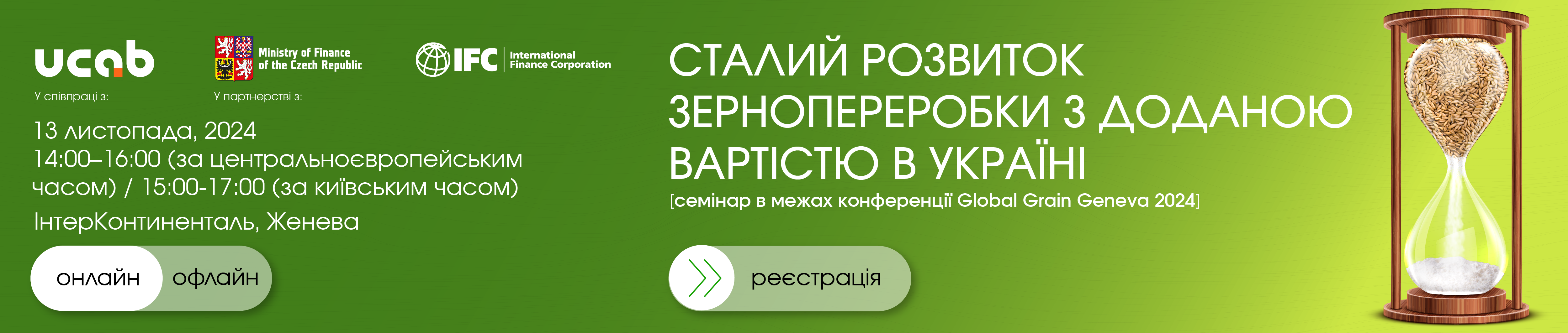 Міжнародна Фінансова Корпорація (IFC) та асоціація «Український клуб аграрного бізнесу» (УКАБ) запрошують на семінар «Сталий розвиток зернопереробки з доданою вартістю в Україні», який відбудеться в межах Global Grain Geneva 2024, події, яка об'єднує 800+ професіоналів галузі з усього світу для спілкування та обговорення викликів і рішень.