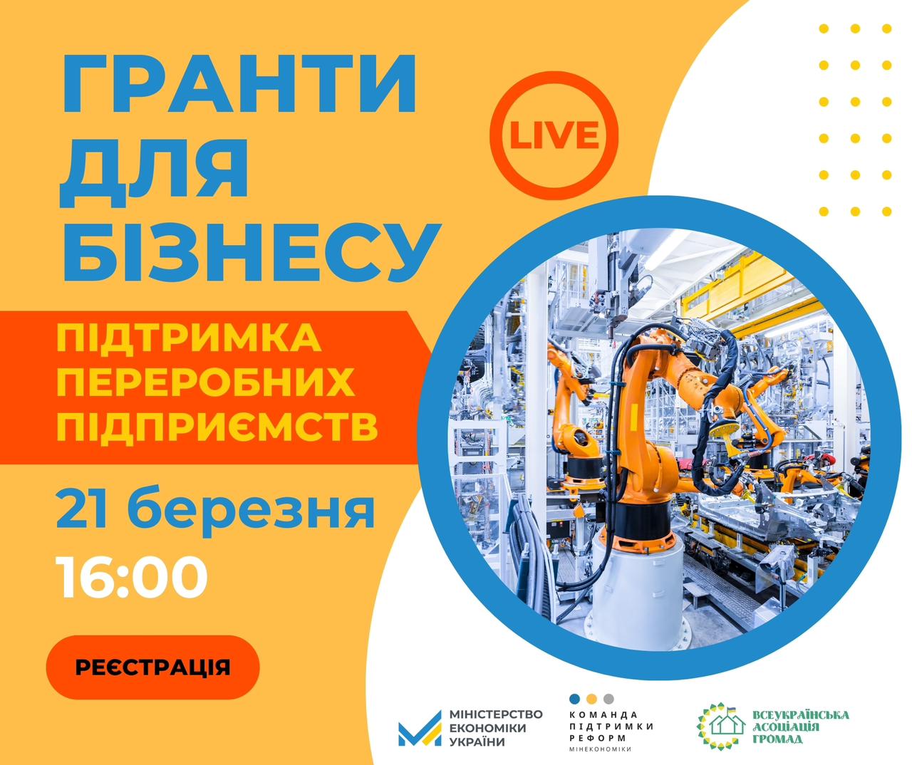 Запрошуємо приєднатися до вебінару «Гранти для бізнесу. Підтримка переробних підприємств», що відбудеться 21 березня 2024 року о 16:00. Під час заходу ви дізнаєтеся про можливості державної підтримки переробного бізнесу та особливості подачі заявок на грант. Організатор – Команда підтримки реформ Міністерства економіки України. “Переробка має стати складовою національної економічної ідеї”, – наголосила Міністр економіки України Юлія Свириденко у листопаді 2023 року. Грантова програма для підтримки переробних підприємств стала частиною проєкту єРобота, який Мінекономіки запустило для підтримки підприємництва у липні 2022 року. Станом на березень 2024 р. з моменту запуску програми підприємці, які займаються переробкою, отримали 633 гранти на 3,2 млрд грн. Кожен підприємець може отримати грант на розвиток або відкриття переробного бізнесу на суму до 8 млн грн. Подати заявку можуть як діючі підприємці, так і люди, що не мають досвіду ведення власної справи. Заяви подаються через портал Дія разом з бізнес-планом. Обов'язковою умовою отримання гранту є створення нових робочих місць. Під час вебінару «Гранти для бізнесу. Підтримка переробних підприємств» ви дізнаєтеся: Вебінар відбудеться за участі Надії Бігун, заступниці Міністра економіки України. Модератор – Денис Шемякін, директор Команди підтримки реформ Мінекономіки. Реєстрація на вебінар обов'язкова: https://cutt.ly/jwN0ATb7 Зареєстровані учасники отримають посилання на трансляцію у день вебінару. Захід відбудеться за сприяння Міністерства економіки України та Всеукраїнської асоціації громад. Для детальнішої інформації контактуйте з Командою підтримки реформ Мінекономіки: