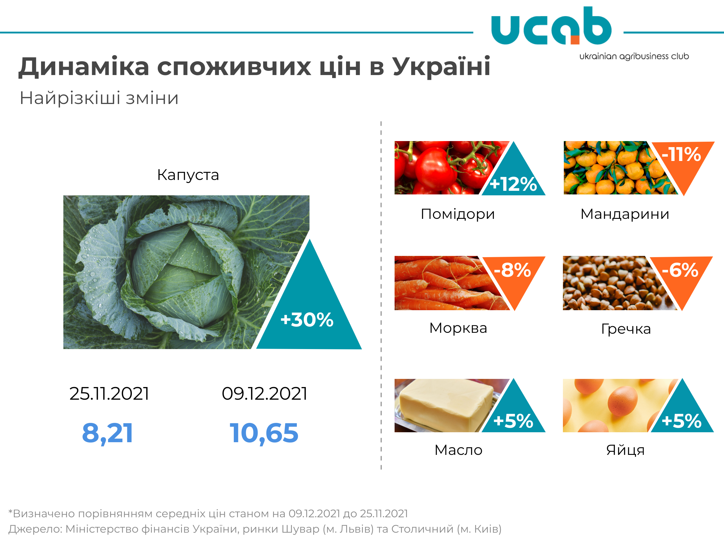 За останні 2 тижні, як і зазвичай, найбільш різкі зміни цін стосувалися овочів та фруктів. Рекордсменом за цей період стала капуста білокачанна, яка зросла в ціні на 30% (+2,44 грн) і станом на 9 грудня становить близько 10,65 грн за кг. За попередніми оцінками, цього року українські аграрії трішки зменшили обсяги виробництва капусти в порівнянні з минулим роком через достатньо низьку ціну в 2020 році і зменшення зацікавленості з боку аграріїв у виробництві даного овочу. Крім того, ще додався фактор у підвищеному попиті з боку населення через сезоне скорочення пропозицій інших овочів, що і призвело до такого зростання ціни.