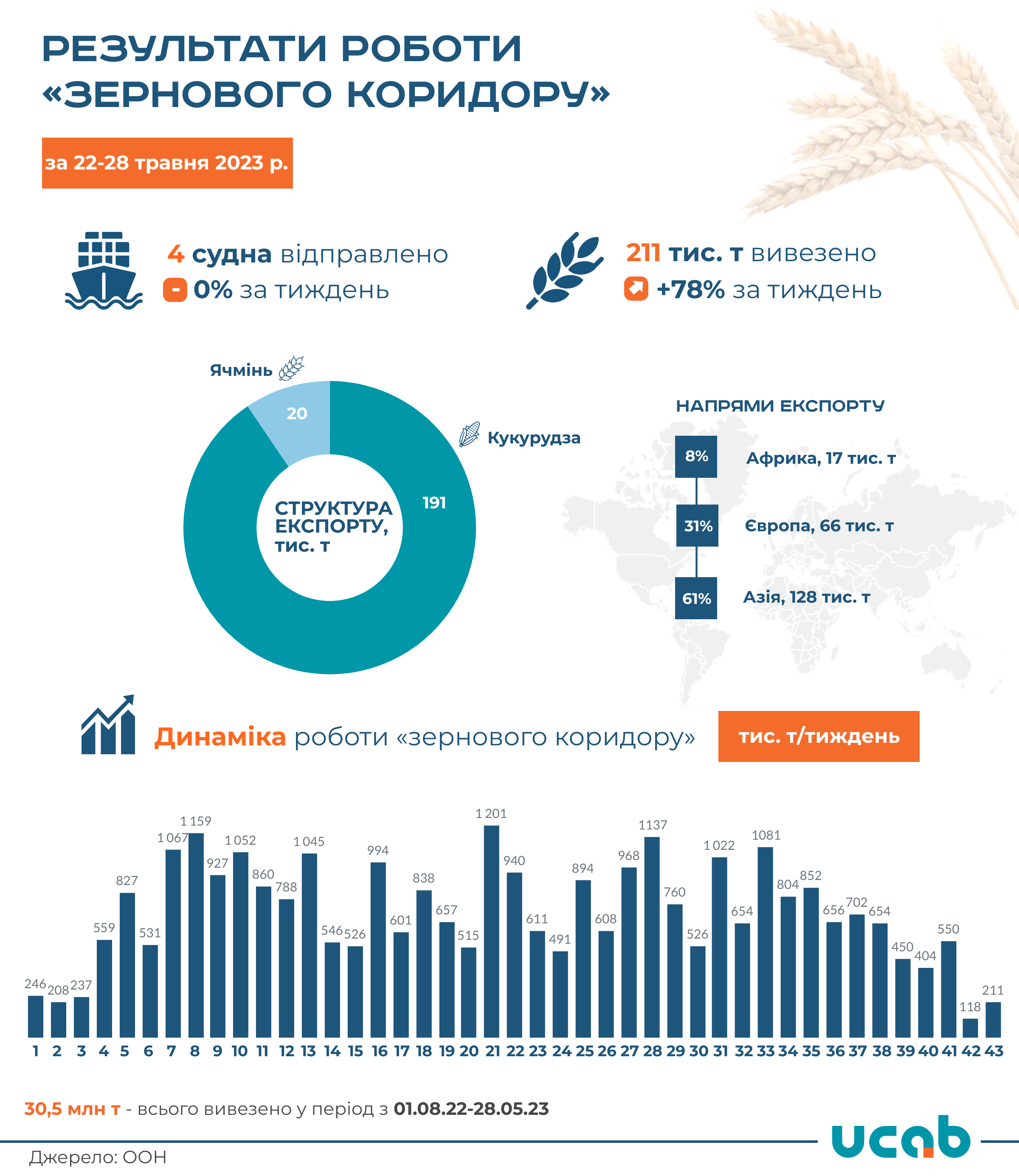 За 43-ій тиждень роботи «зернового коридору» з 22 по 28 травня 2023 року через морські порти Одеської області було експортовано 210,5 тис. т агропромислової продукції, що на 78% більше відвантажень цим каналом, ніж тиждень тому. Приріст є, однак це мінімальні відвантаження в порівнянні з потенціалом цього каналу експорту.