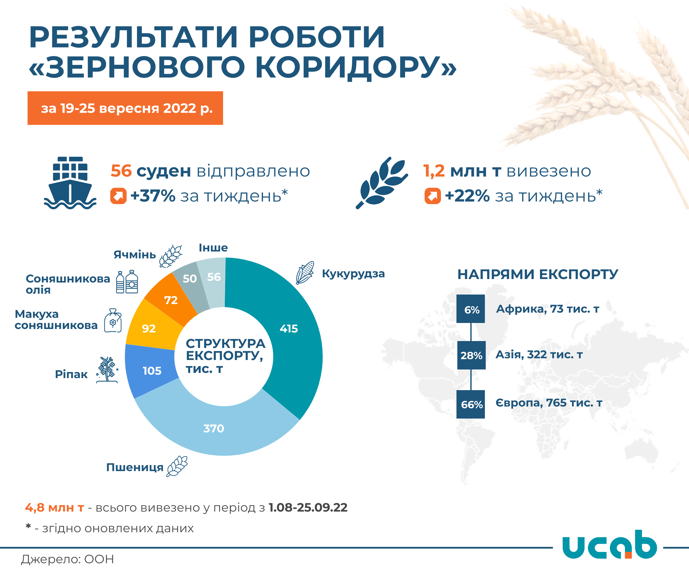 За 8-ий тиждень роботи «зернового коридору» з 19 по 25 вересня 2022 року через морські порти Одеської області було експортовано 1,2 млн т агропромислової продукції, що на 22% перевищує відвантаження цим каналом тиждень тому.