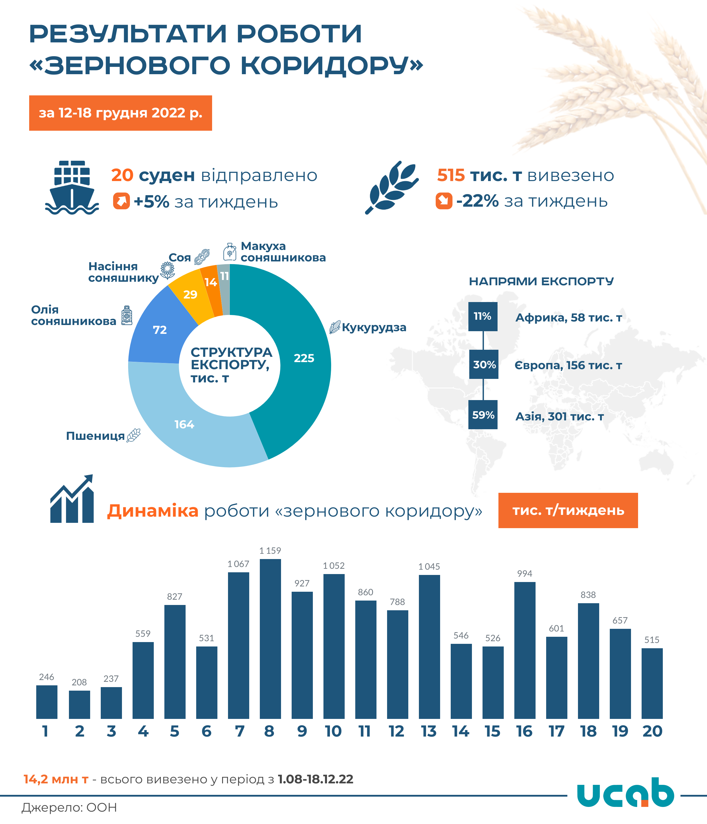 За 20-ий тиждень роботи «зернового коридору» з 12 по 18 грудня 2022 року через морські порти Одеської області було експортовано 514,8 тис. т агропромислової продукції, що на 22% менше відвантаження даним каналом тиждень тому.