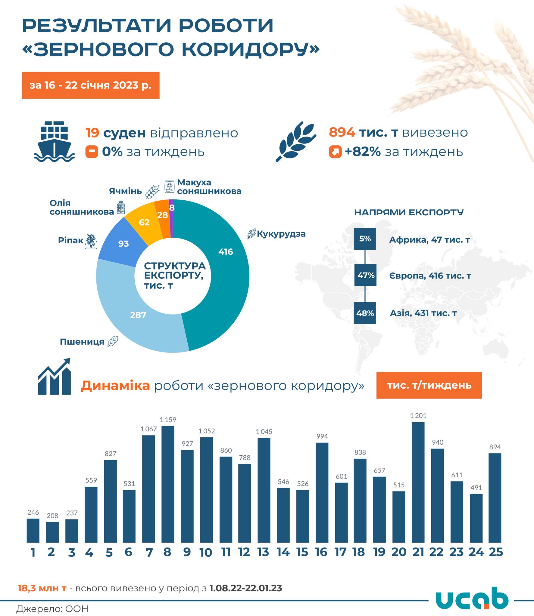 За 25-ий тиждень роботи «зернового коридору» з 16 по 22 січня 2023 року через морські порти Одеської області було експортовано 894 тис. т агропромислової продукції, що на 82% більше відвантажень даним каналом тиждень тому. При цьому кількість кораблів, що були завантажені за цей тиждень, була така сама – 19 одиниць.