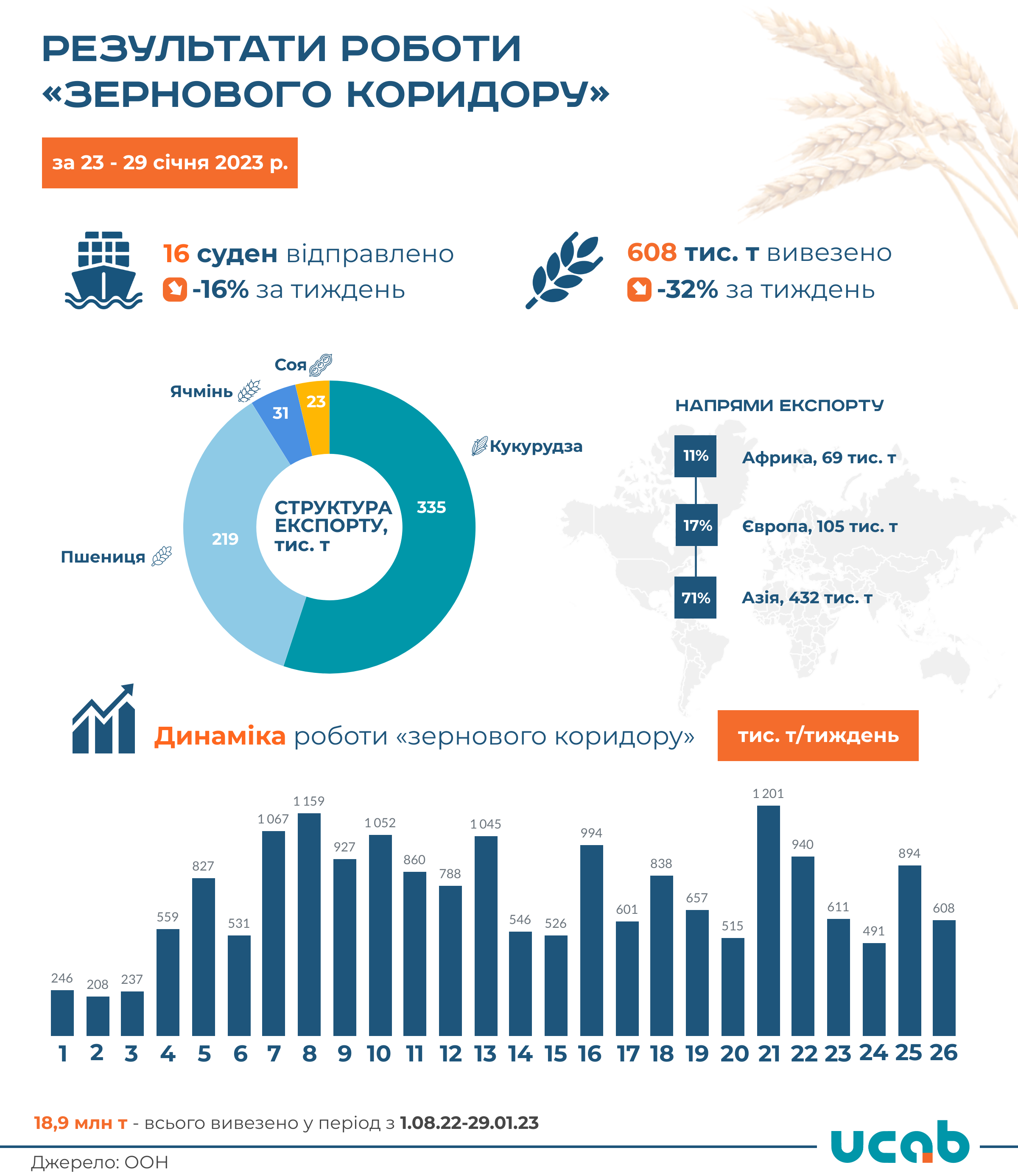 За 26-ий тиждень роботи «зернового коридору» з 23 по 29 січня 2023 року через морські порти Одеської області було експортовано 608 тис. т агропромислової продукції, що на 32% менше відвантажень цим каналом тиждень тому.