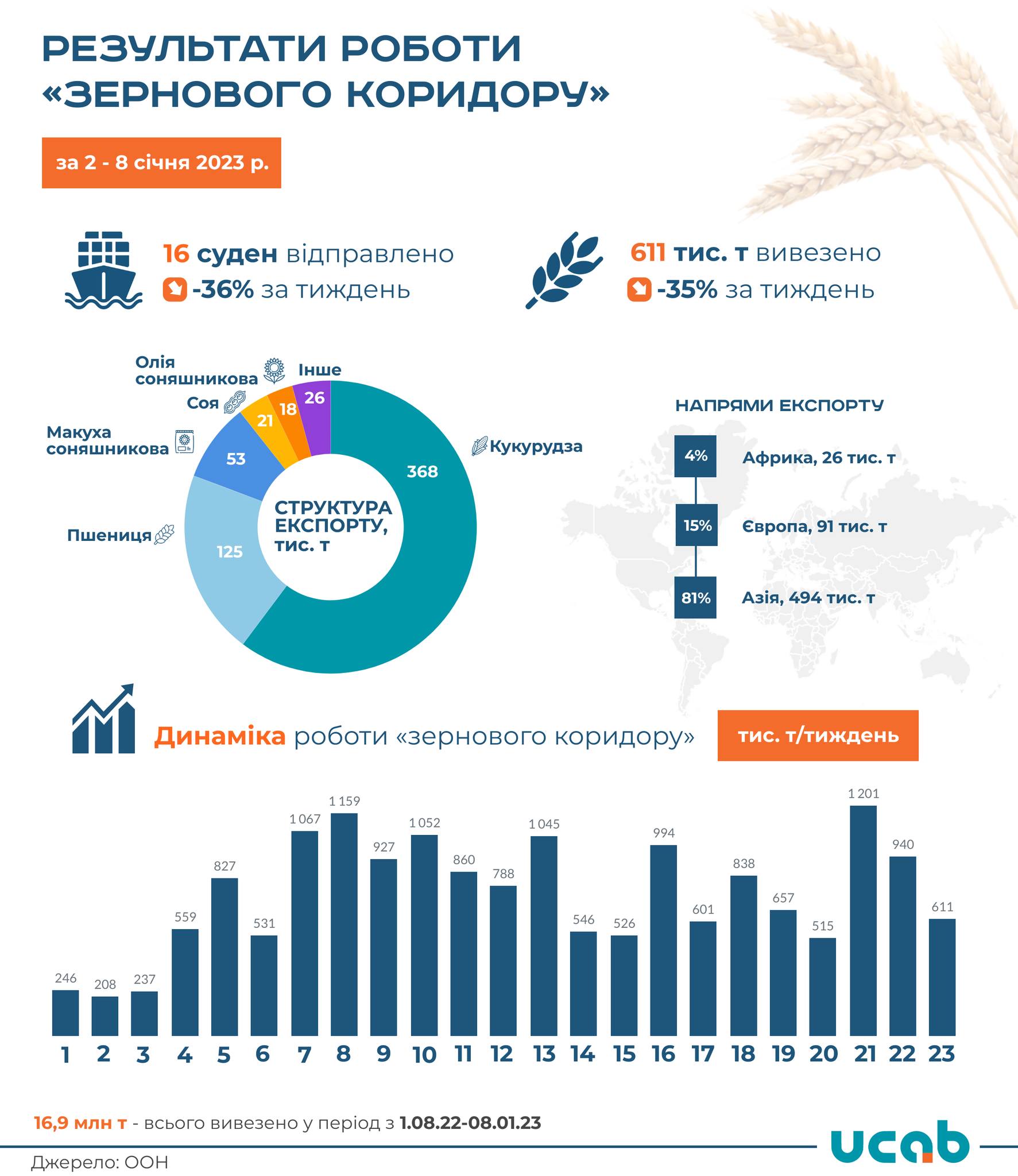 За 23-ий тиждень роботи «зернового коридору» з 2 по 8 січня 2023 року через морські порти Одеської області було експортовано 611 тис. т агропромислової продукції, що на 35% менше відвантажень даним каналом тиждень тому. При цьому кількість кораблів, що були завантажені за цей тиждень, становила 16, що на 9 одиниць менше попереднього тижня.