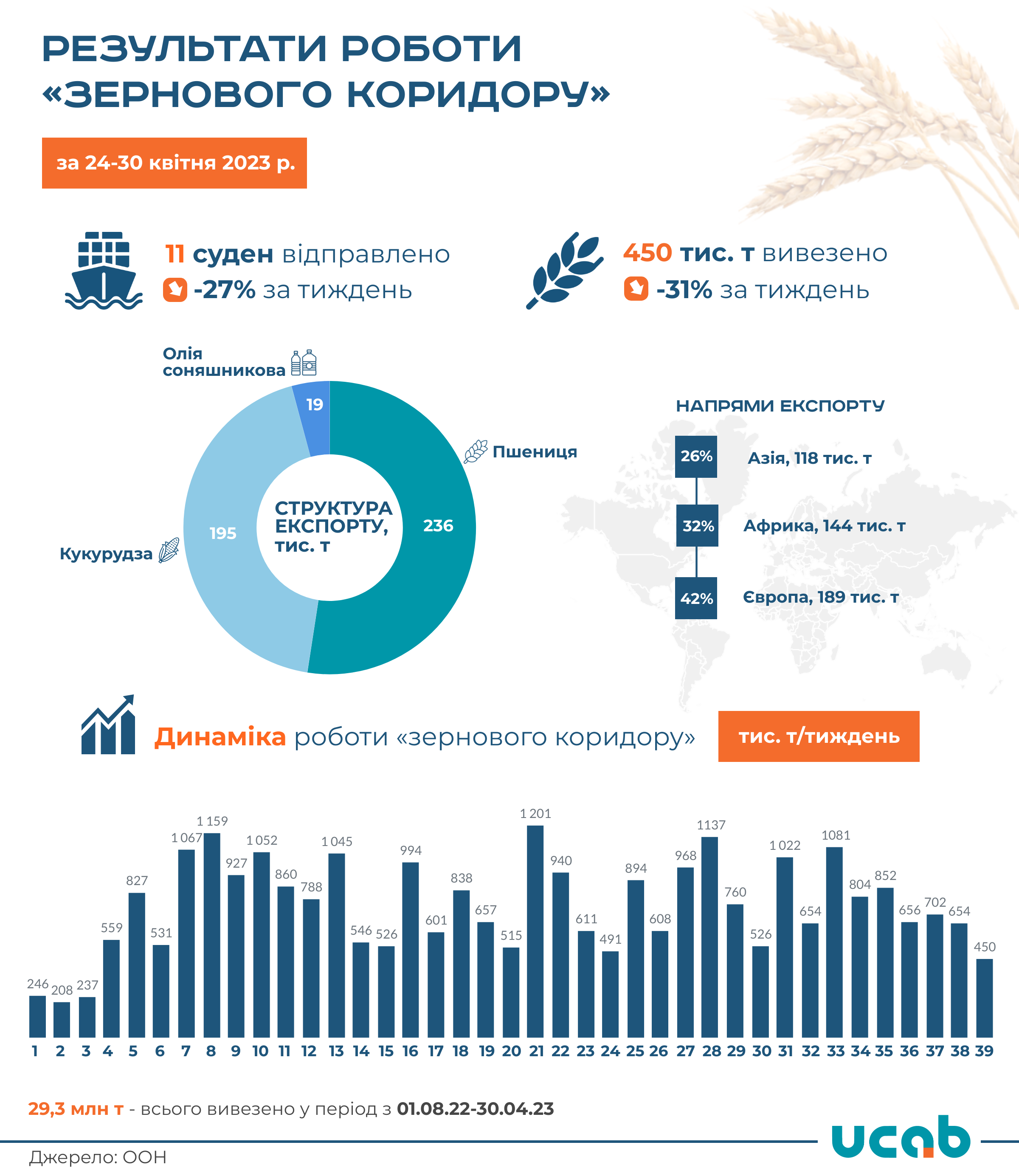 За 39-ий тиждень роботи «зернового коридору» з 24 по 30 квітня 2023 року через морські порти Одеської області було експортовано 450,3 тис. т агропромислової продукції, що на 31% менше відвантажень цим каналом, ніж тиждень тому.