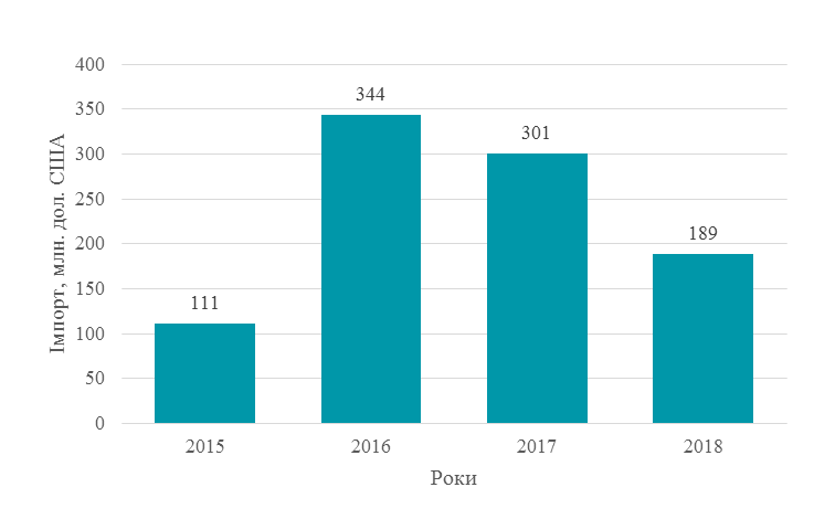 У 2015 році цей показник склав 111 млн дол. США; у 2016-му сягнув 344 млн дол. США; у 2017 році було імпортовано комбайнів на суму 301 млн дол. США, а у 2018 році – на 189 млн дол. США (рис. 2).