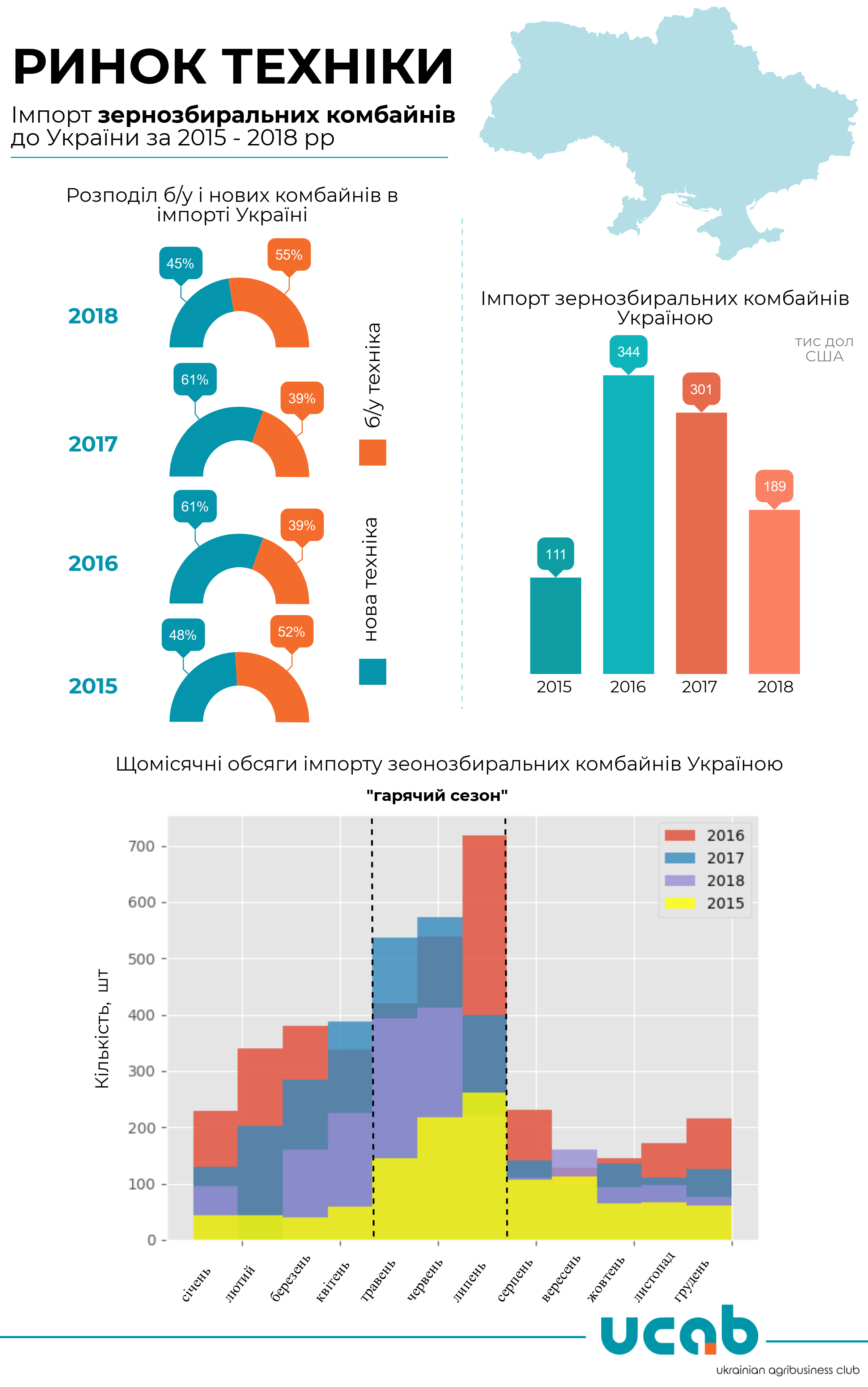 Кількість нових та вживаних комбайнів, які завозяться в Україну, приблизно однакова. За 4 роки до України завезли близько 52% нових зернозбиральних комбайнів і 48% вживаних.