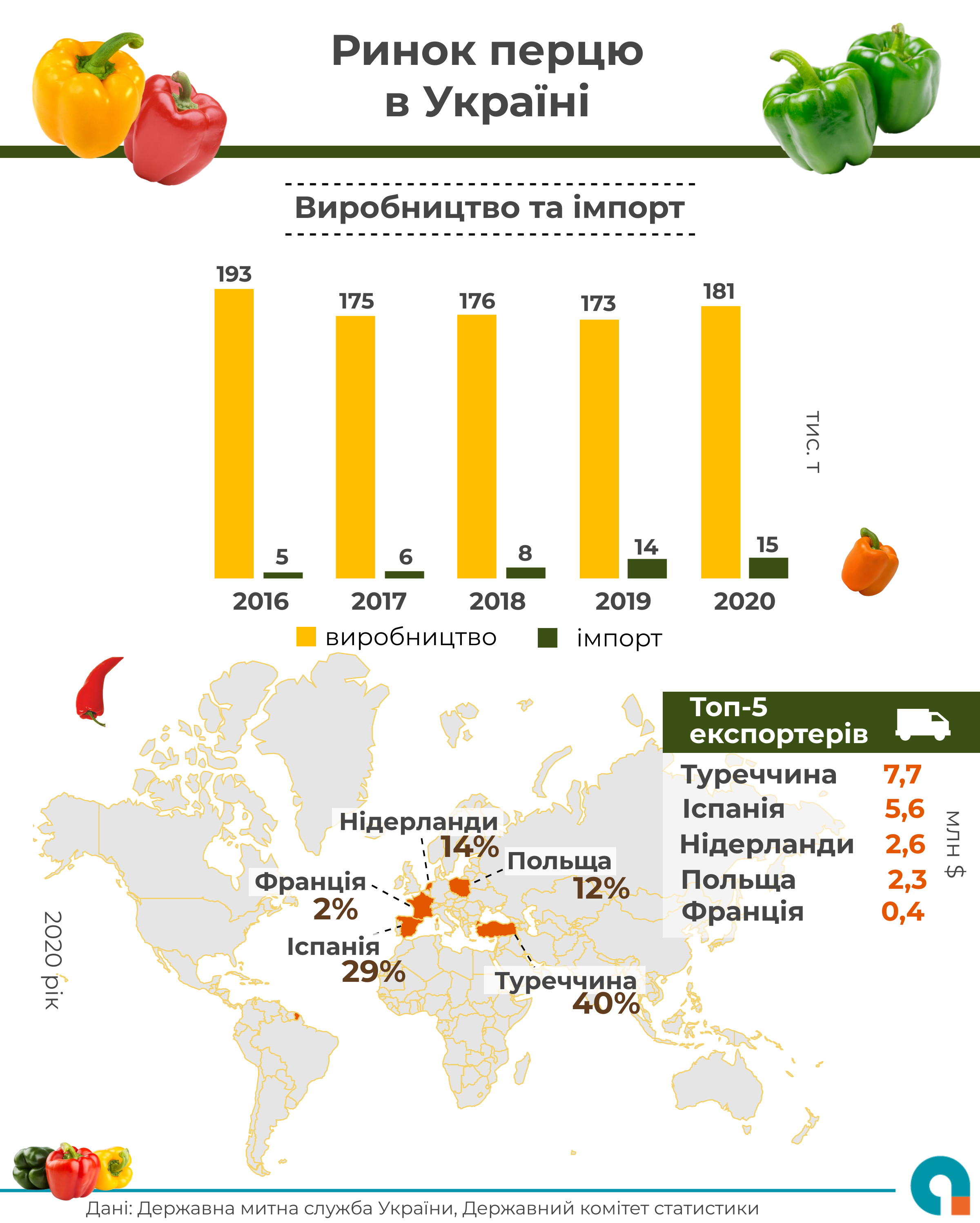 “За останні 5 років обсяг імпорту перцю в Україну зріс в 3 рази, що пов’язано з формуванням більш здорової культури споживання та вживанням овочів цілий рік. Основні обсяги імпортних поставок припадають на зимово-весняні місяці, коли власне виробництво перцю в Україні практично відсутнє. В 2020 році було імпортовано 14,6 тис. т даного овочу, що на 7% вище аналогічного показника попереднього року. Водночас експортні відвантаження перцю мінімальні. Основними постачальниками перцю в Україну є: Туреччина (40% українського імпорту в грошовому вимірі в 2020 році), Іспанія (29%), Нідерланди (14%), Польща (12%) та Франція (2%)”, - коментує Світлана Литвин, аналітик УКАБ.