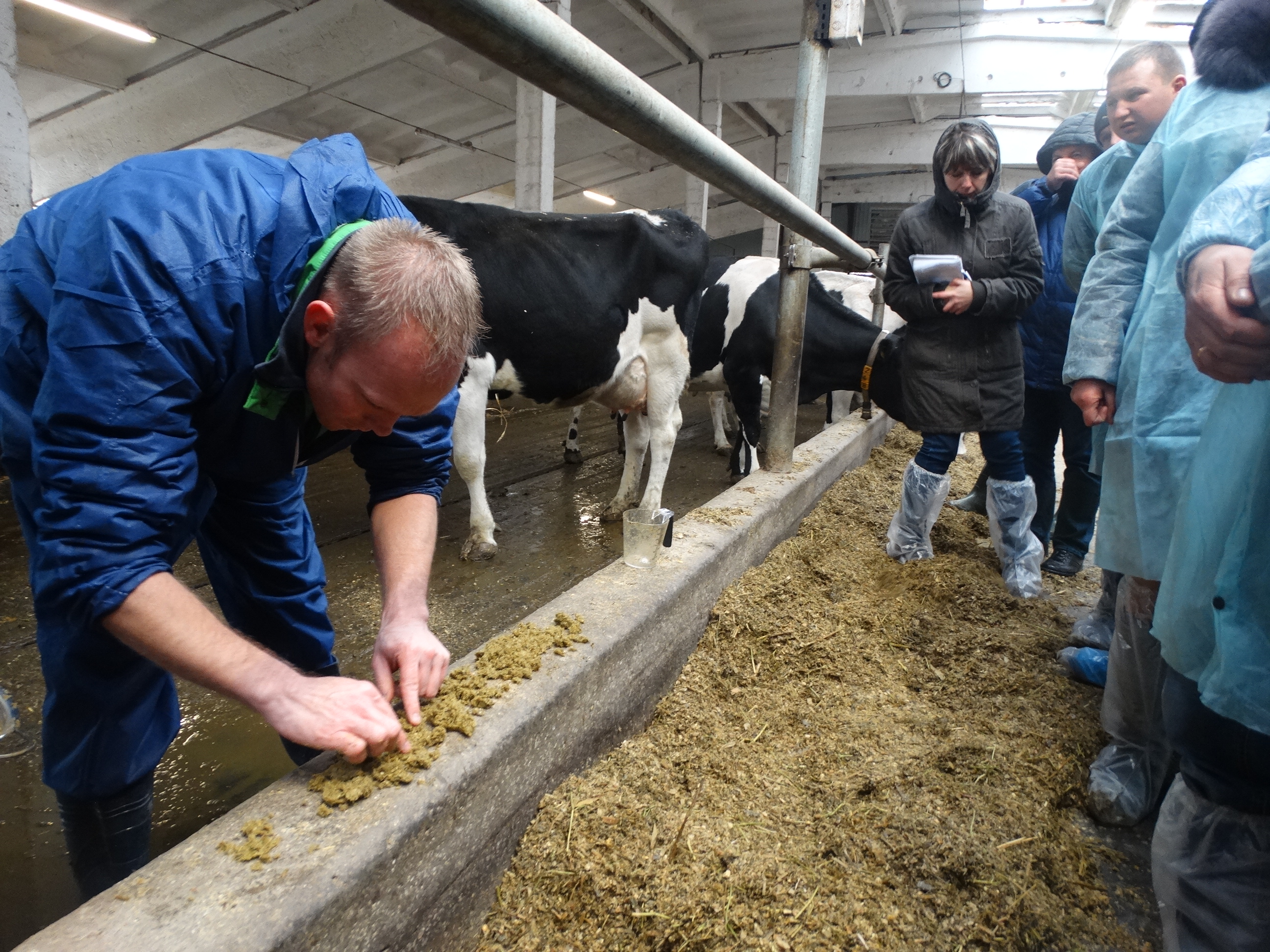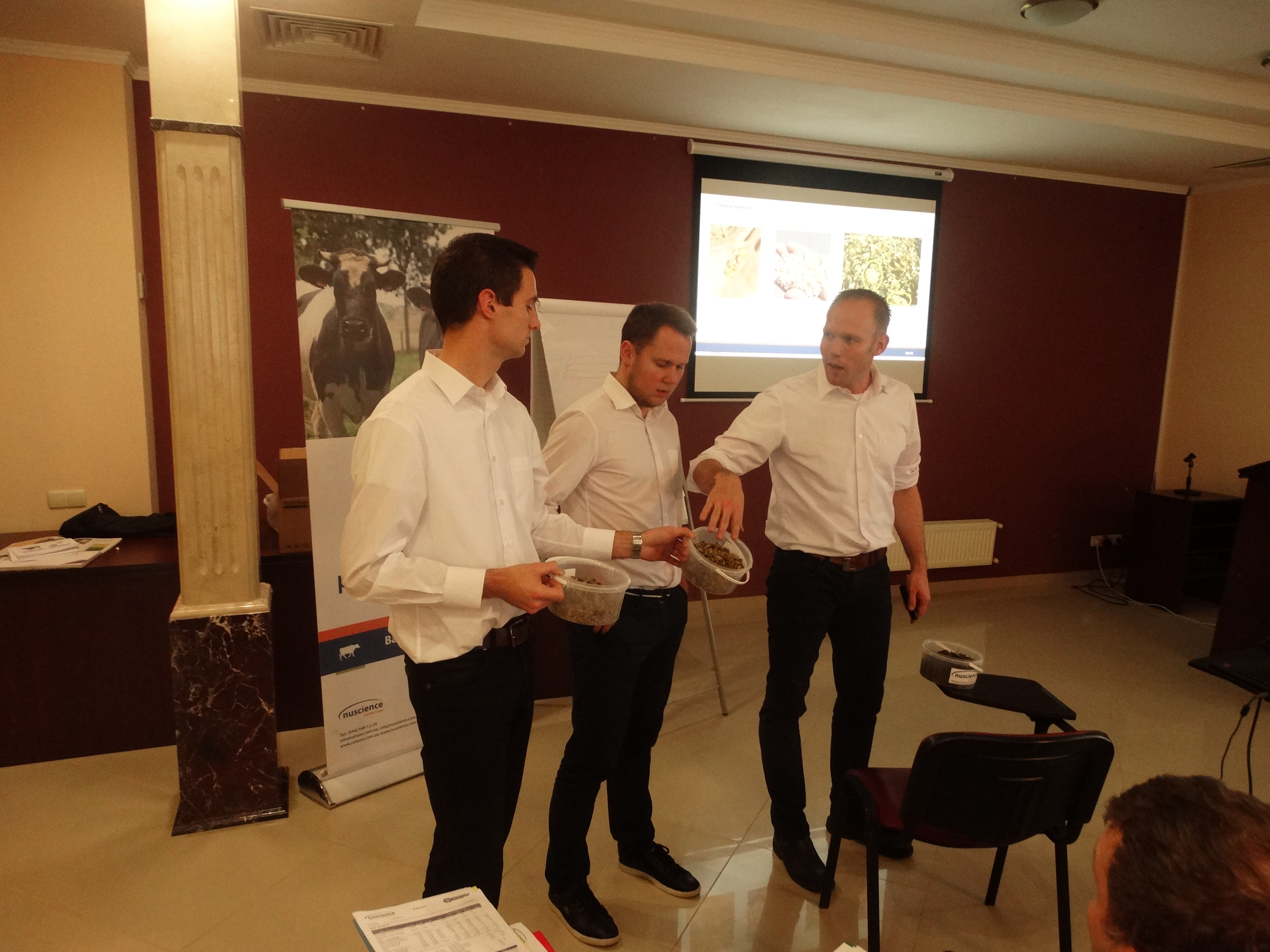 Другого дня агровиробники взяли участь у фаховому турі на виробничі потужності СТОВ «Ломовате» Черкаської області, яке утримує 375 корів. Середня продуктивність стада складає 9000 кг молока на рік, у наступному році господарство планує вийти на продуктивність 10 000 кг. На підприємстві учасники семінару змогли оцінити та проаналізувати якість кормів, годівлю та умови утримання корів, покращили навички візуальної оцінки стану тварин, а також отримали відповіді на запитання та практичні поради від експертів.