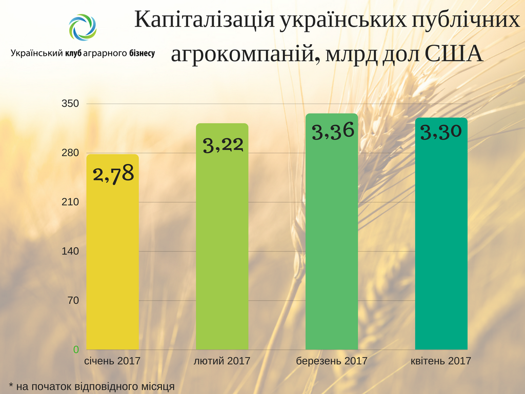 Загальна капіталізація українських публічних аграрних компаній, акції яких котируються на міжнародних фінансових біржах, станом на 18 квітня 2017 року склала 3,3 млрд дол. США, що на 19,5% більше, ніж на початок цього року (+542 млн дол. США).