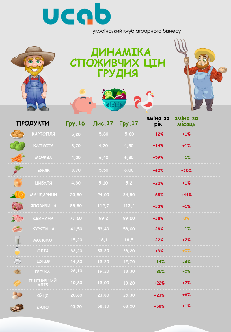 «Не дивлячись на інфляційні процеси, ріст цін на овочі та фрукти є типовим для передноворічних тижнів, оскільки це період активного імпорту іноземних товарів. Також для зимового періоду характерний ріст цін на молоко під впливом сезонного зниження виробництва. У подальшому можливий ріст цін на м’ясо, що зумовлено подорожчанням на світовому ринку, так і скороченням поголів’я на внутрішньому ринку», - прокоментувала Дар’я Гриценко, експерт аграрних ринків Асоціації «Український клуб аграрного бізнесу».