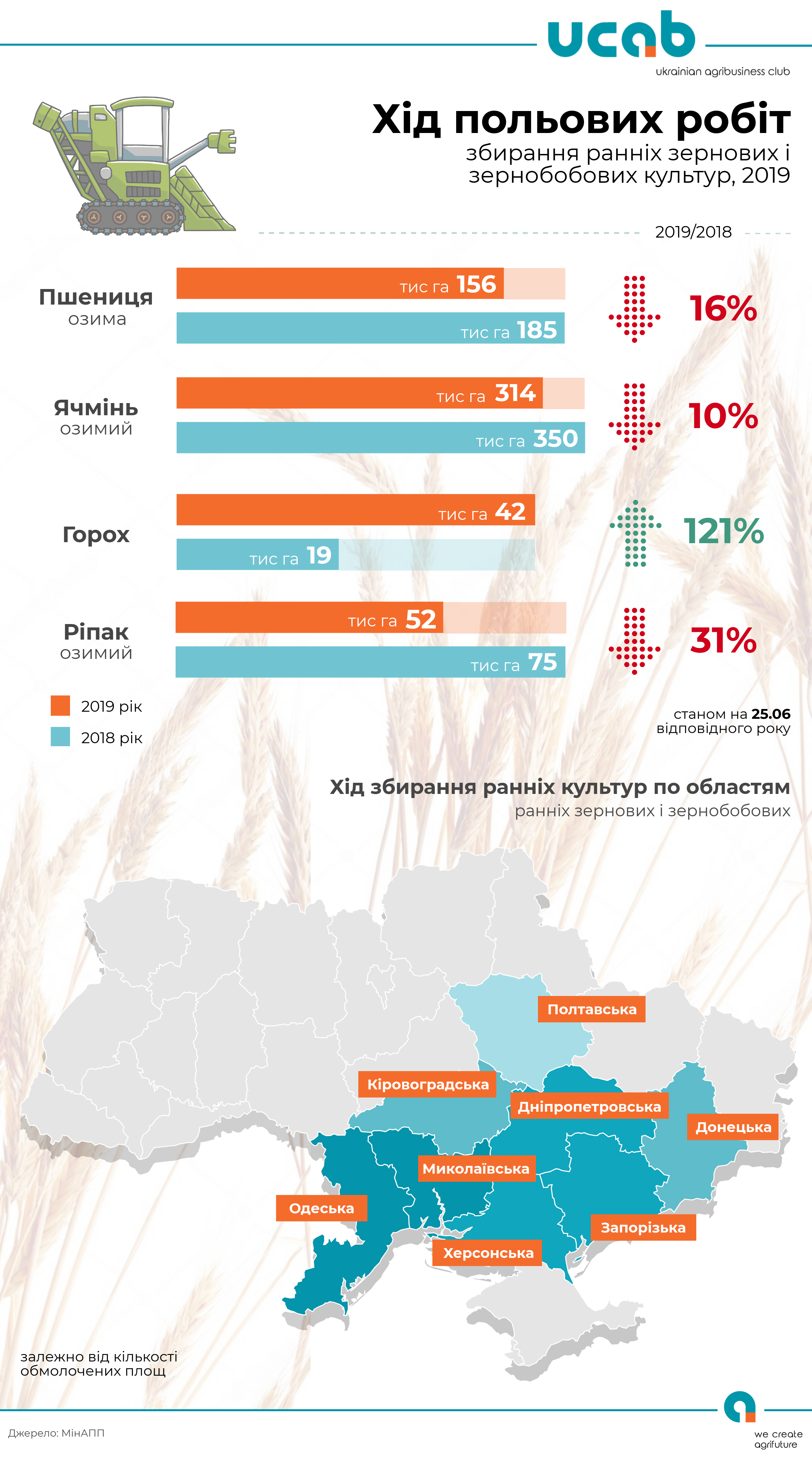 Станом на 25 червня в Україні вже обмолочено 522,2 тис. га ранніх зернових і зернобобових культур, що становить 5% від загальної прогнозованої площі збору ранніх зернових і зернобобових культур. Збиральна кампанія розпочалася ще всередині червня. Наразі активно обмолочуються землі степової зони України, а саме: Одеська, Миколаївська, Херсонська, а також Запорізька і Дніпропетровська області.
