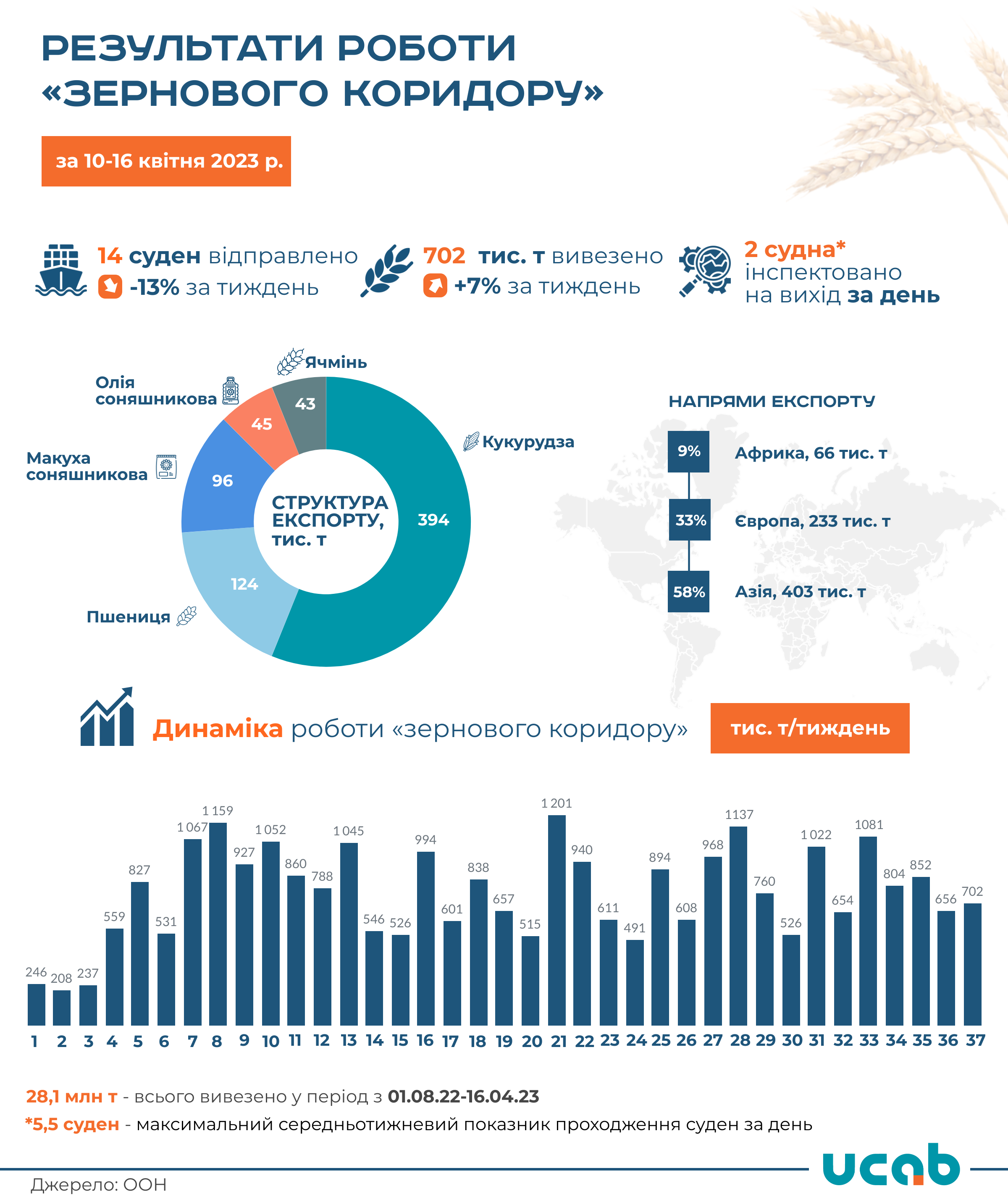 За 37-ий тиждень роботи «зернового коридору» з 10 по 16 квітня 2023 року через морські порти Одеської області було експортовано 702,3 тис. т агропромислової продукції, що на 7% більше відвантажень цим каналом тиждень тому.