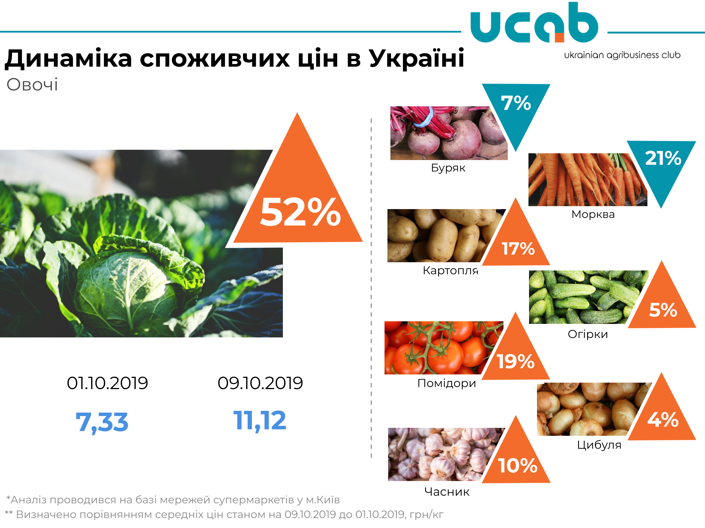 Серед основних овочів найбільших змін зазнали ціни на білокачанну капусту – станом на початок цього тижня, порівняно з минулим, вона подорожчала більш ніж вдвічі і станом на 09 жовтня коштувала в середньому 11,12 грн/кг (минулого тижня – 7,33 грн/кг). Вслід за капустою зросли середні ціни на помідори - на 19% (станом на 9 жовтня 30,61 грн/кг). Серед основних категорій овочів та фруктів також спостерігається подорожчання картоплі на 17% (станом на 9 жовтня 16,68 грн/кг). Ціни на часник зросли в середньому на 10% до 49,45 грн/кг. Менш різких змін зазнали ціни на огірки – збільшились на 5%(до 20,1 грн/кг станом на 09 жовтня) та цибулю - на 4% до 9,26 грн/кг.