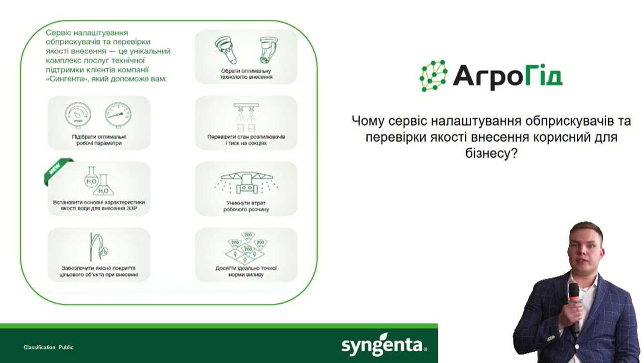 Саме для того, аби максимально ефективно проводити різні види робіт, діагностики роботи агрегатів та допомагати аграріям компанія Syngenta має власний сервіс технічної підтримки «АгроГід», що включає сервіс із налаштування протруювальних машин та перевірки якості нанесення, сервіс налаштування обприскувачів та перевірки якості ЗЗР, послуги мережі діагностичних центрів тощо. «За допомогою наших фахівців і сервісу можна підібрати оптимальні технології внесення, перевірити стан розпилювачів та їхнього зношення, оптимальні параметри роботи оприскувача, встановити параметри та якість води. Ми використовуємо лише спеціальне сертифіковане обладнання для діагностики», - прокоментував Дмитро Бовкун.
