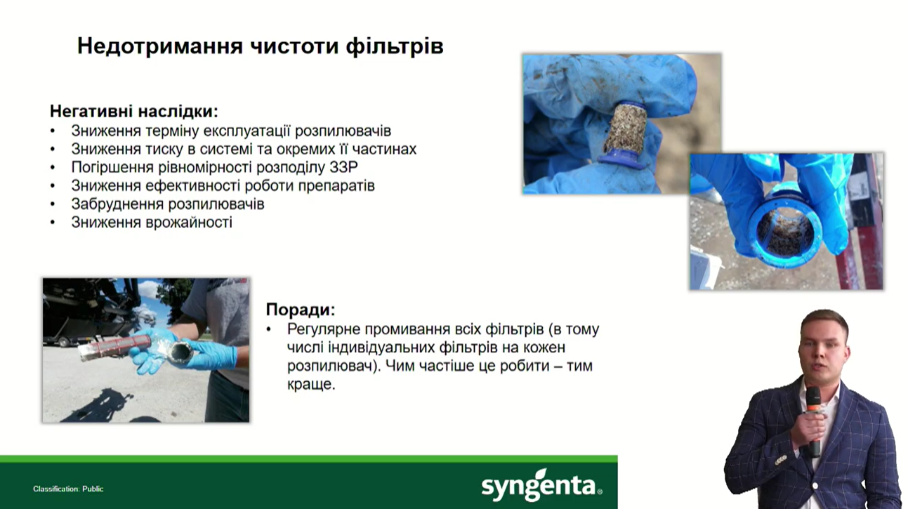 Фахівець з технологій внесення компанії Syngenta Дмитро Бовкун розповів основні проблеми та помилки при внесенні ЗЗР та їх ефективне вирішення. Зокрема, за словами експерта, для ефективної роботи обприскувачів є обов’язковим використання фільтрів: «Фільтри потрібно використовувати на всіх етапах — від транспортування до внесення ЗЗР. Фільтр повинен бути як центральним, так і на секціях, а кожному із розпилювачів». Також на роботу обприскувача впливає дотримання оптимальної швидкості руху агрегату, висоти штанги під час розпилювання, контроль робочого тиску.
