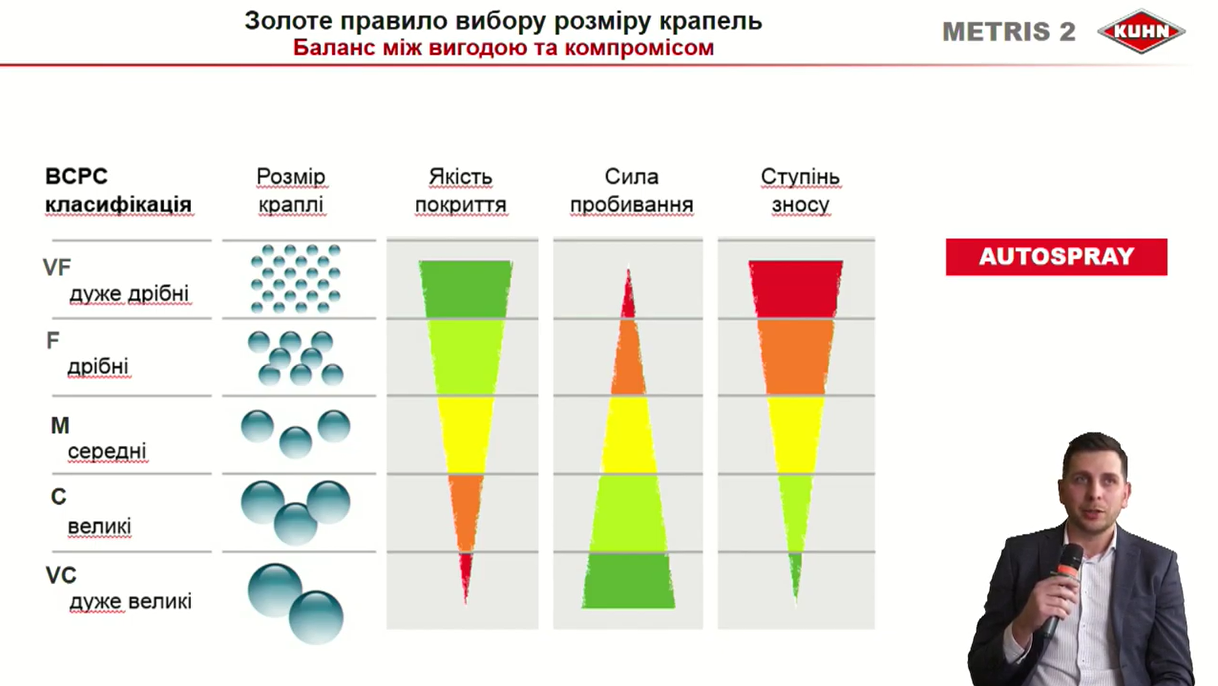 Під кожен препарат є свій розмір краплі для того, аби він максимально ефективно спрацював. Оптимальні умови для обприскування — це температура до 25 градусів та швидкість вітру для щільових розпилювачів 3 метри на секунду, у випадку інжекторних – до 5 метрів на секунду при вологості 60%. «Звичайно, ідеальні умови і практика є різними речами. Тому основною перевагою системи AUTOSPRAY є контроль та регулювання розміру крапель при розпиленні, незалежно від умов», - додав Дмитро Довженко.