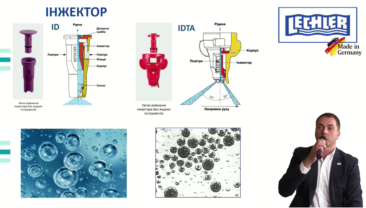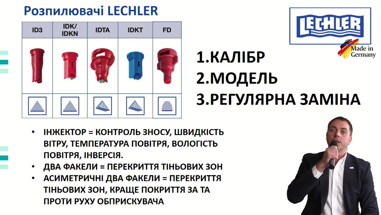 Представник компанії Lechler в Україні Олександр Паславський розповів про чинники, які впливають на якість внесення та ефективність ЗЗР. Такі чинники як опади, температура повітря, відносна вологість, температура ґрунту, якість самого препарату плюс недотримання рекомендацій виробника ЗЗР, жорсткість води часто мають значний вплив на кінцевий урожай на полі: «За допомогою наших розробок ви зможете досягти певного рівня контролю над деякими з цих факторів непевності. Завдяки вірно підібраному під ваші потреби калібру, моделі та регулярній заміні розпилювачів, можна суттєво нівелювати вплив сторонніх факторів на внесення».