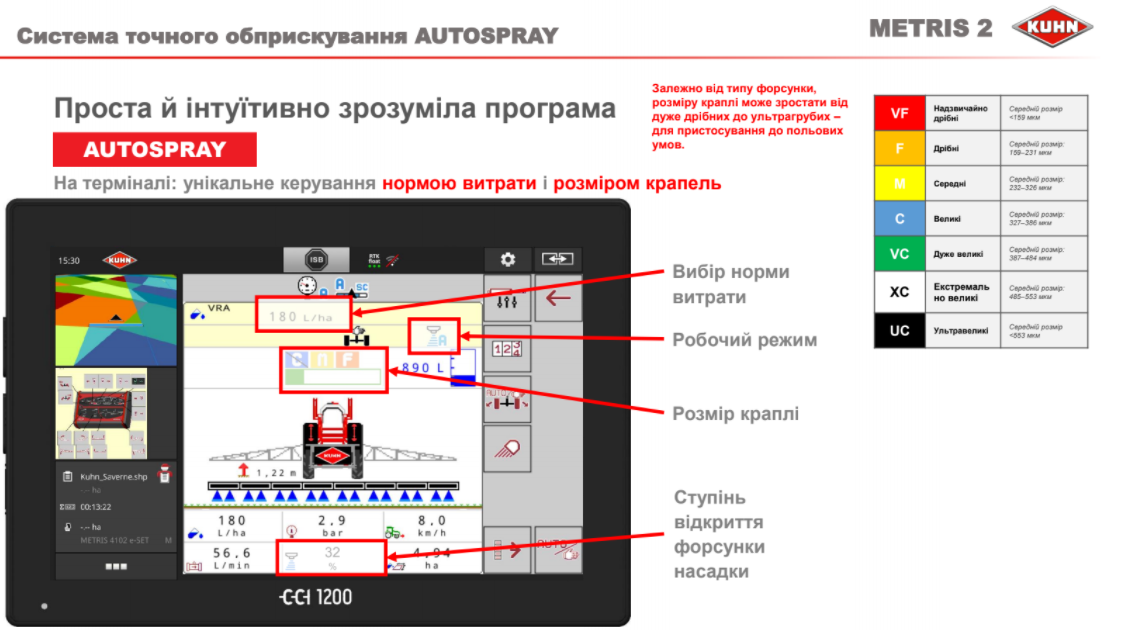 Комерційний менеджер «KUHN-Україна» Дмитро Довженко розповів про практику використання нової системи KUHN AutoSpray для точного розпилення з регулюванням розміру крапель, більшим робочим діапазоном та компенсацією на поворотах, яка дозволяє здійснювати високоточне диференційне внесення. «Вперше ця система була представлена у 2019 році на причіпному обприскувачі Metrіs 2 та отримала медаль «Машина року» у Європі. Система AUTOSPRAY дає можливість постійного підтримання потрібної норми витрати та правильного розміру крапель при змінній швидкості, і відповідно до потреб поля. Залежно від погодних умов, можна обрати розмір краплі від великих до дрібних і запускати оприскувач у роботу. На налаштування системи знадобиться лише 10 секунд», - розповів експерт.