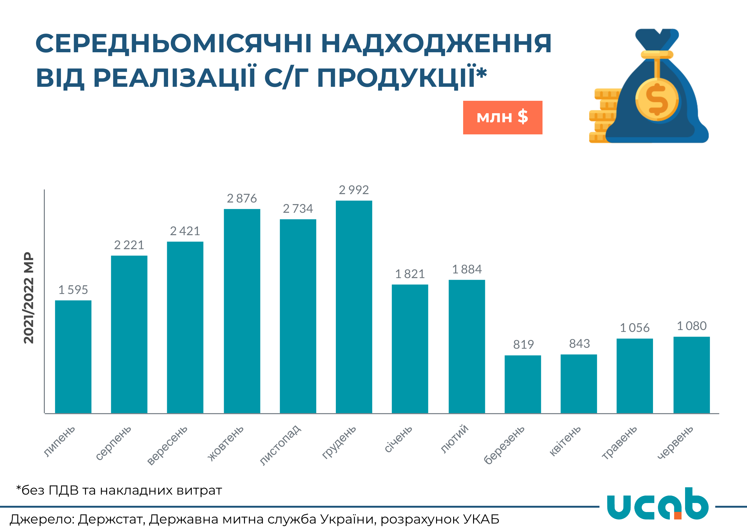 В 2021 році середньомісячні надходження від реалізації продукції с/г виробниками складали $1,71 млрд. З початку повномасштабної війни виручка скоротилася в середньому до $950 млн на місяць, в першу чергу через блокаду морських портів. Таким чином, кожного місяця аграрії недоотримують щонайменше $760 млн надходжень, що в річному еквіваленті складає $9,1 млрд.