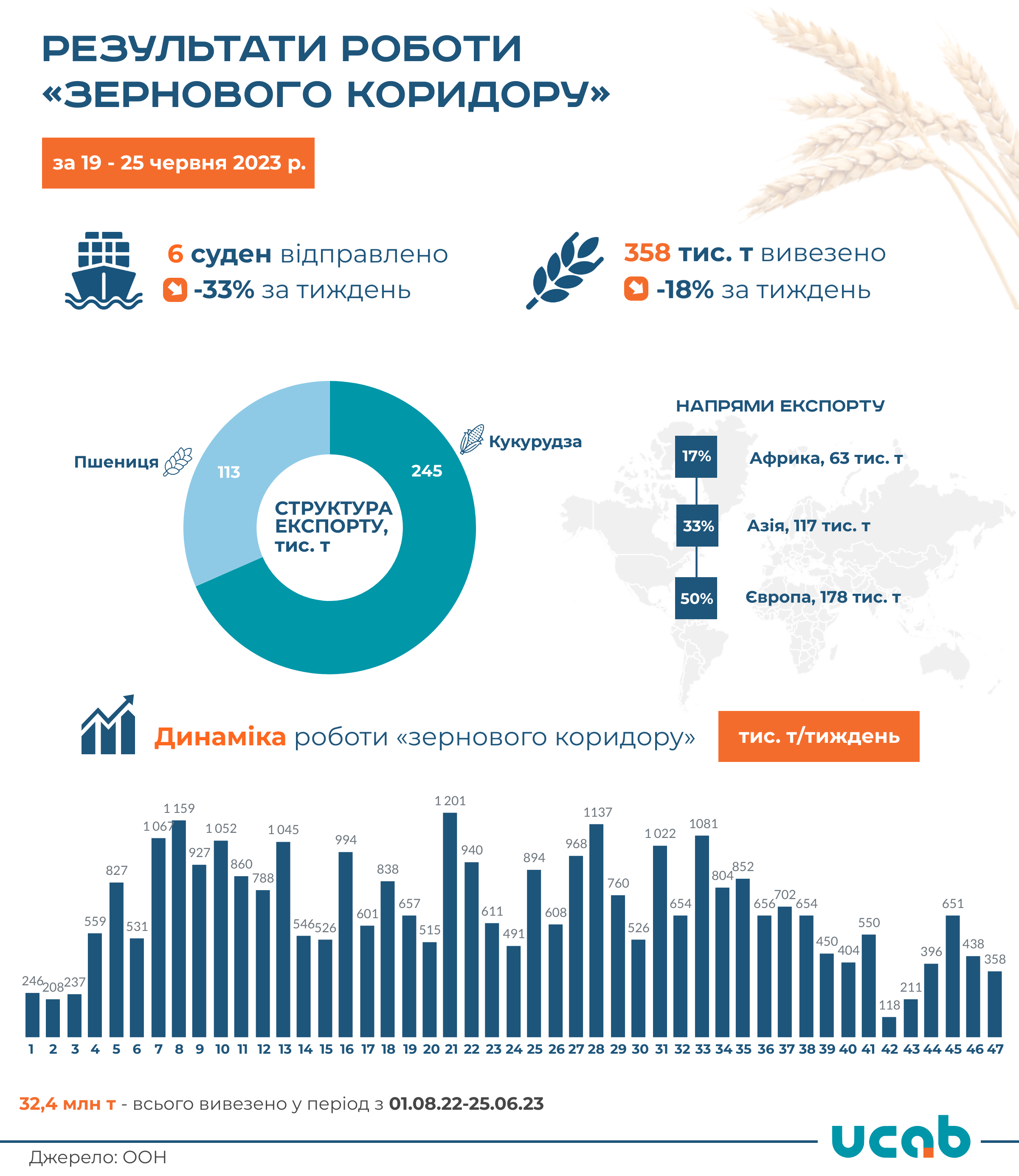 За 47-ий тиждень роботи «зернового коридору» з 19 по 25 червня 2023 року через морські порти Одеської області було експортовано 358,3 тис. т агропромислової продукції, що на 18% менше відвантажень цим каналом тиждень тому.