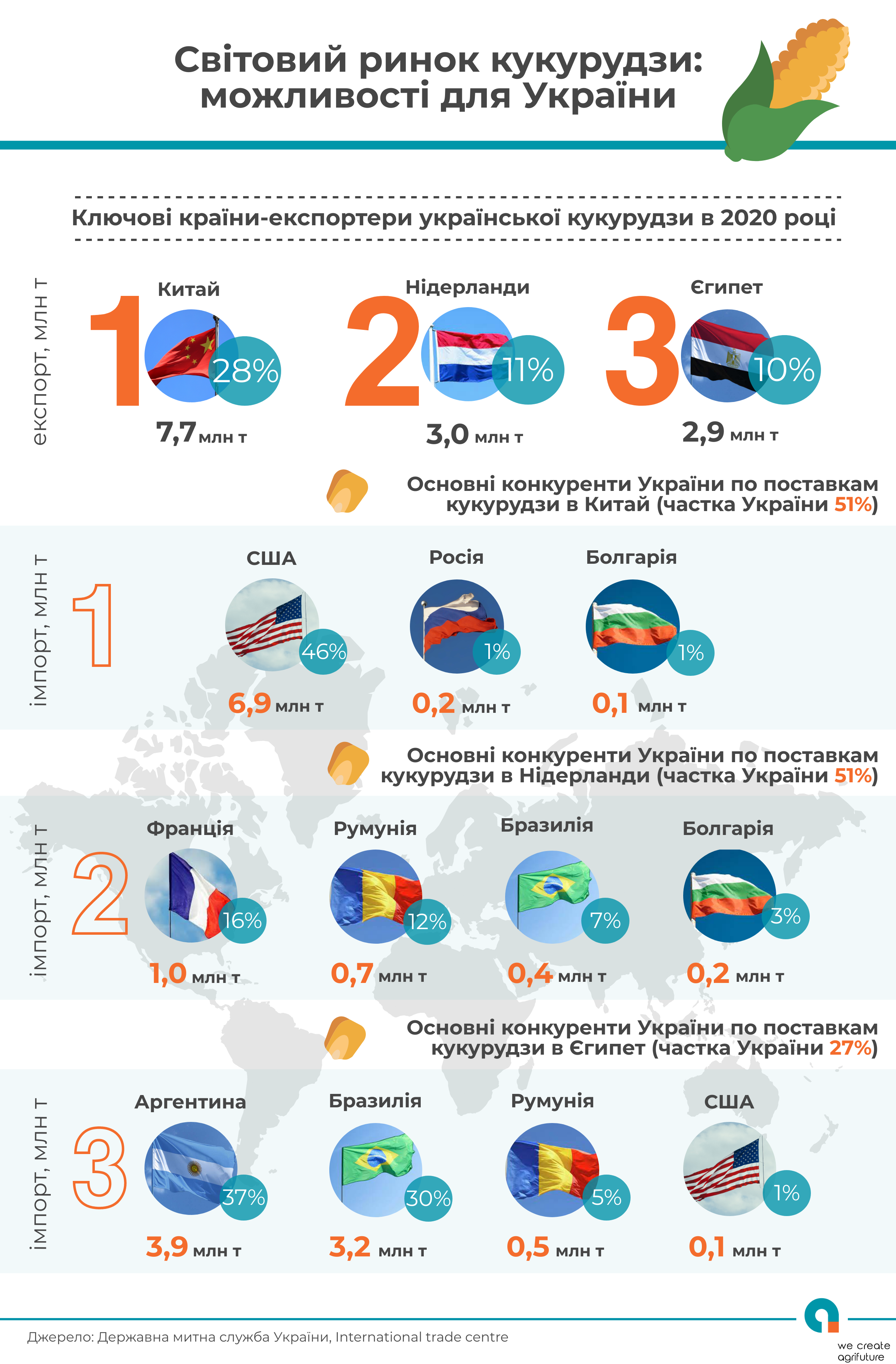 Основними країнами-імпортерами української кукурудзи є Китай (28% українського експорту), Нідерланди (11%) та Єгипет (10%).