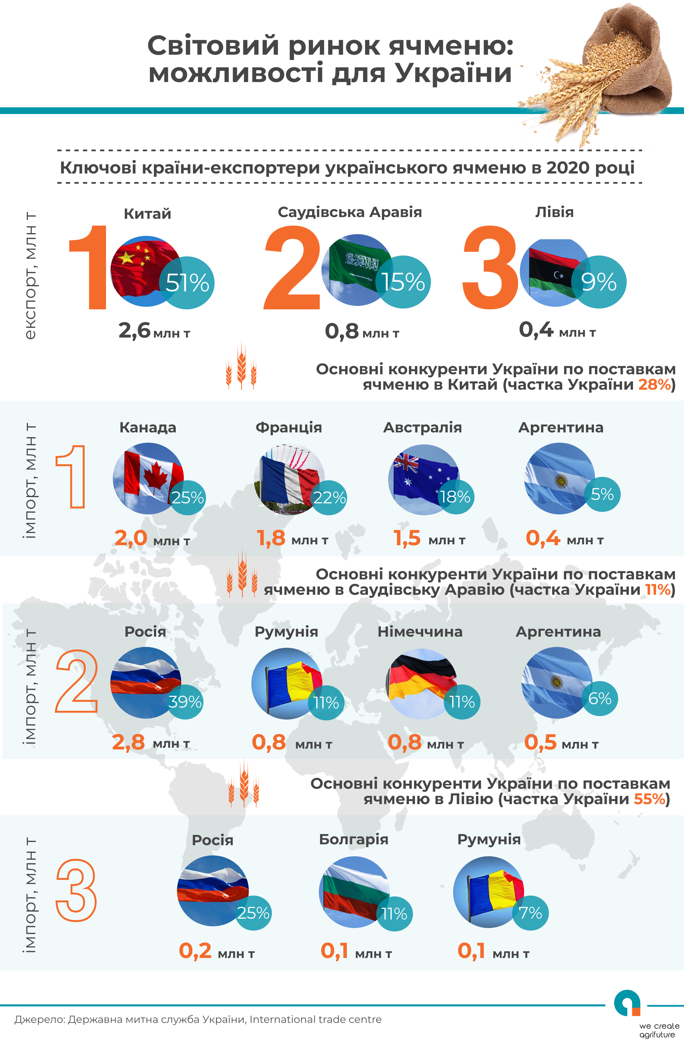 За результатами 2020 року Україна займає 3-ту позицію в рейтингу найбільших експортерів ячменю в світі, поступаючись лише Франції та Російській Федерації.