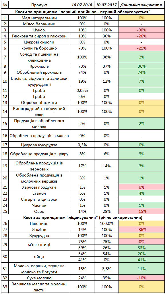 Станом на 10 липня Україна закрила 7 квот на безмитний експорт агропродовольчої продукції до ЄС. Були вибрані об’єми меду, солоду і пшеничної клейковини, оброблених томатів, виноградного і яблучного соку, зернових (кукурудзи і пшениці) та вершкового масла.