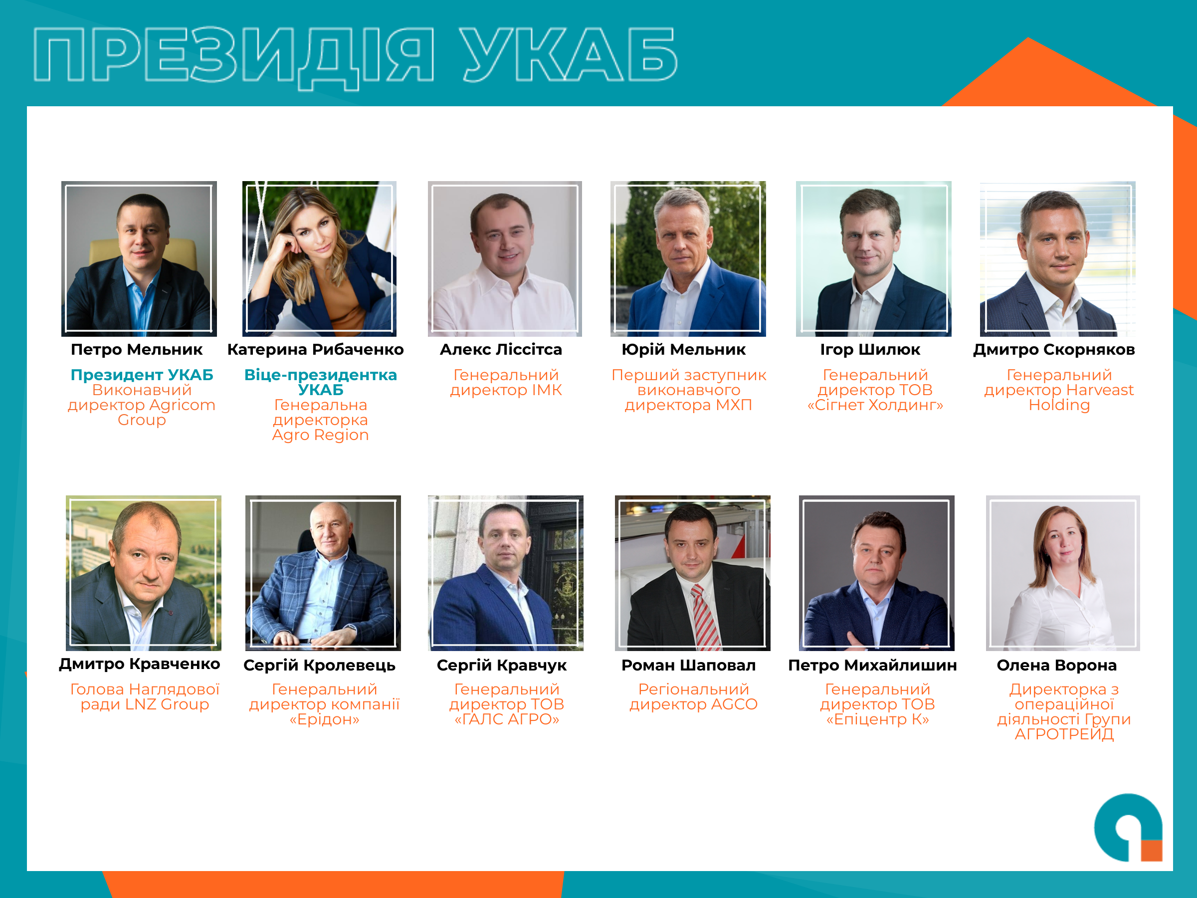 До складу новообраної Президії також увійшли: Алекс Ліссітса, Генеральний директор ІМК, Юрій Мельник, Перший заступник виконавчого директора МХП, Ігор Шилюк, Генеральний директор ТОВ «Сігнет Холдинг», Дмитро Скорняков, Генеральний директор Harveast Holding, Дмитро Кравченко, Голова Наглядової ради LNZ Group, Сергій Кролевець, Генеральний директор компанії «Ерідон», Сергій Кравчук, Генеральний директор ТОВ «ГАЛС АГРО», Роман Шаповал, Регіональний директор AGCO, Петро Михайлишин, Генеральний директор ТОВ «Епіцентр К», Олена Ворона, Директор з операційної діяльності Групи АГРОТРЕЙД.