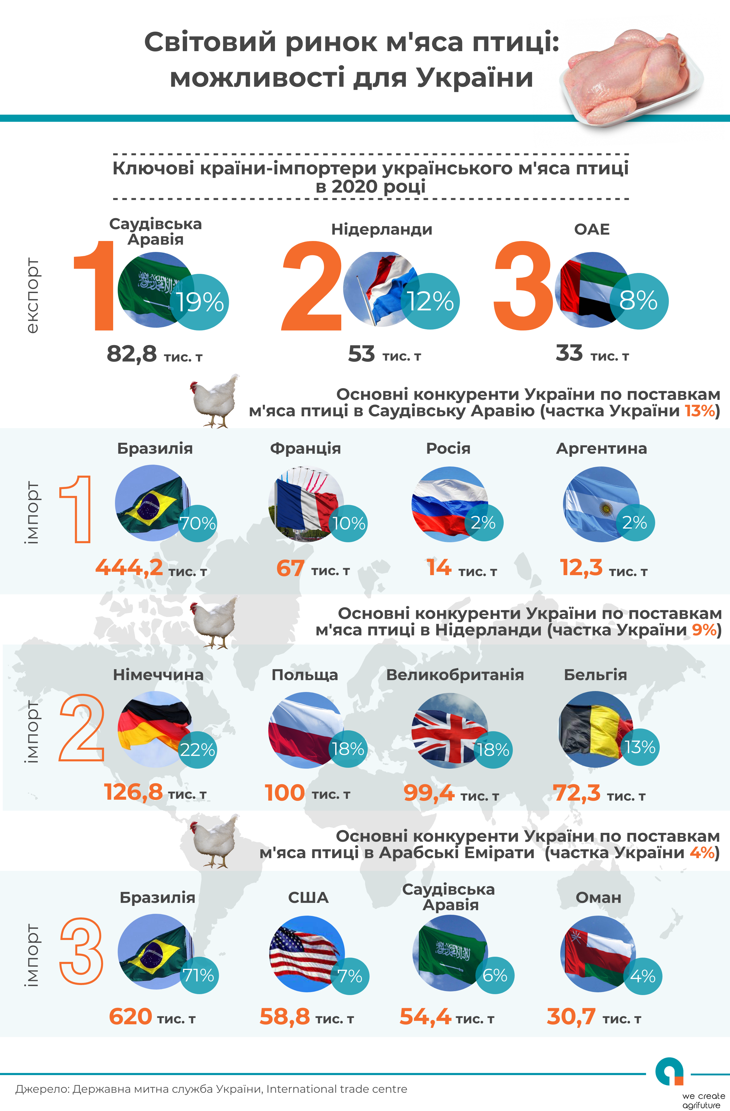 Основними країнами-імпортерами українського м’яса птиці є: Саудівська Аравія (19% українського експорту), Нідерланди (12%) та ОАЕ (8%).