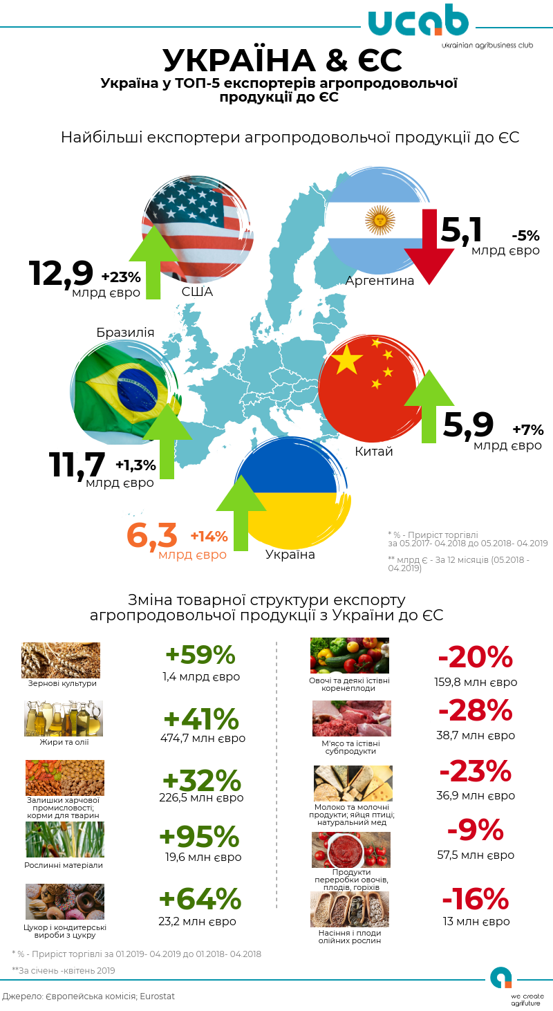 Найбільшими ж постачальниками агропродовольчої продукції до ЄС наразі є США – 12,9 млрд євро та Бразилія – 11,7 млрд євро. Цікавим також є той факт, що США і Україна, це дві країни, котрі показали найбільший приріст торгівлі за вказаний період у відносних (+22,5% у США та +14,2% в України) та абсолютних (+2,4 млрд євро та + 785 млн євро відповідно) показниках.
