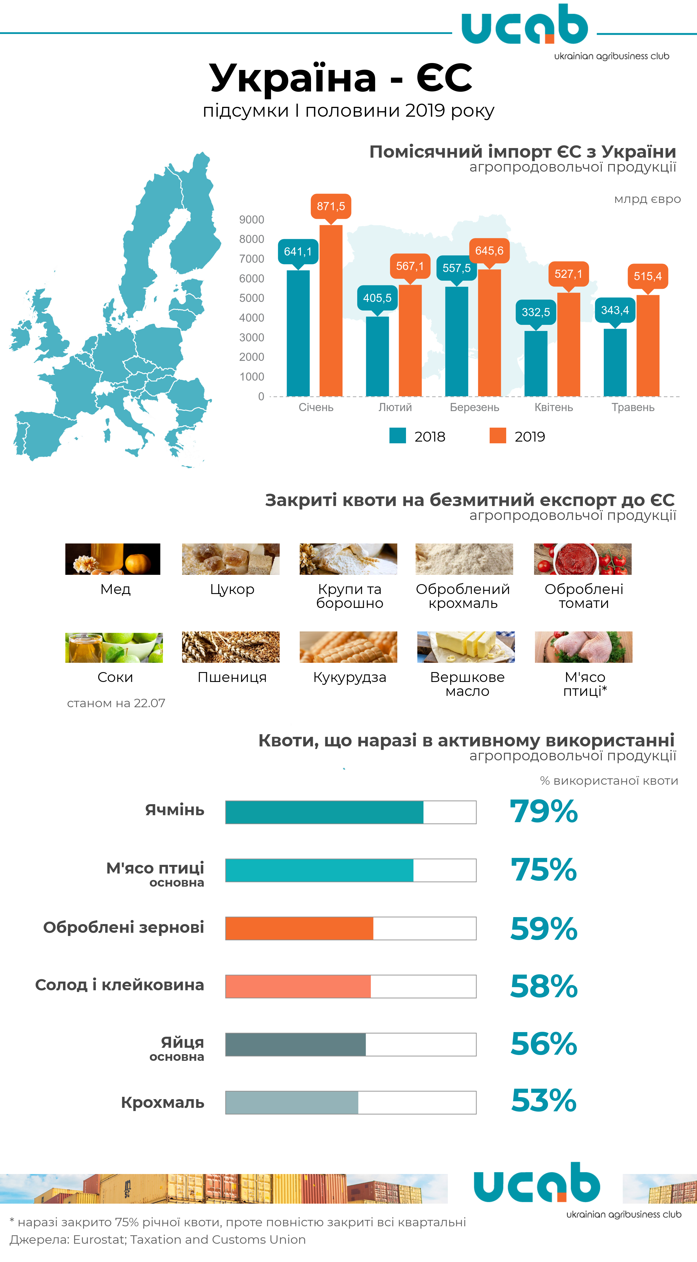 Станом на 22 липня Україна повністю використала квоти на безмитний експорт агропродовольчої продукції до ЄС по 9 групам товарів, а саме: меду, цукру, крупам і борошну, обробленому крохмалю, обробленим томатам, виноградному і яблучному сокам, пшениці, кукурудзі і вершковому маслу.