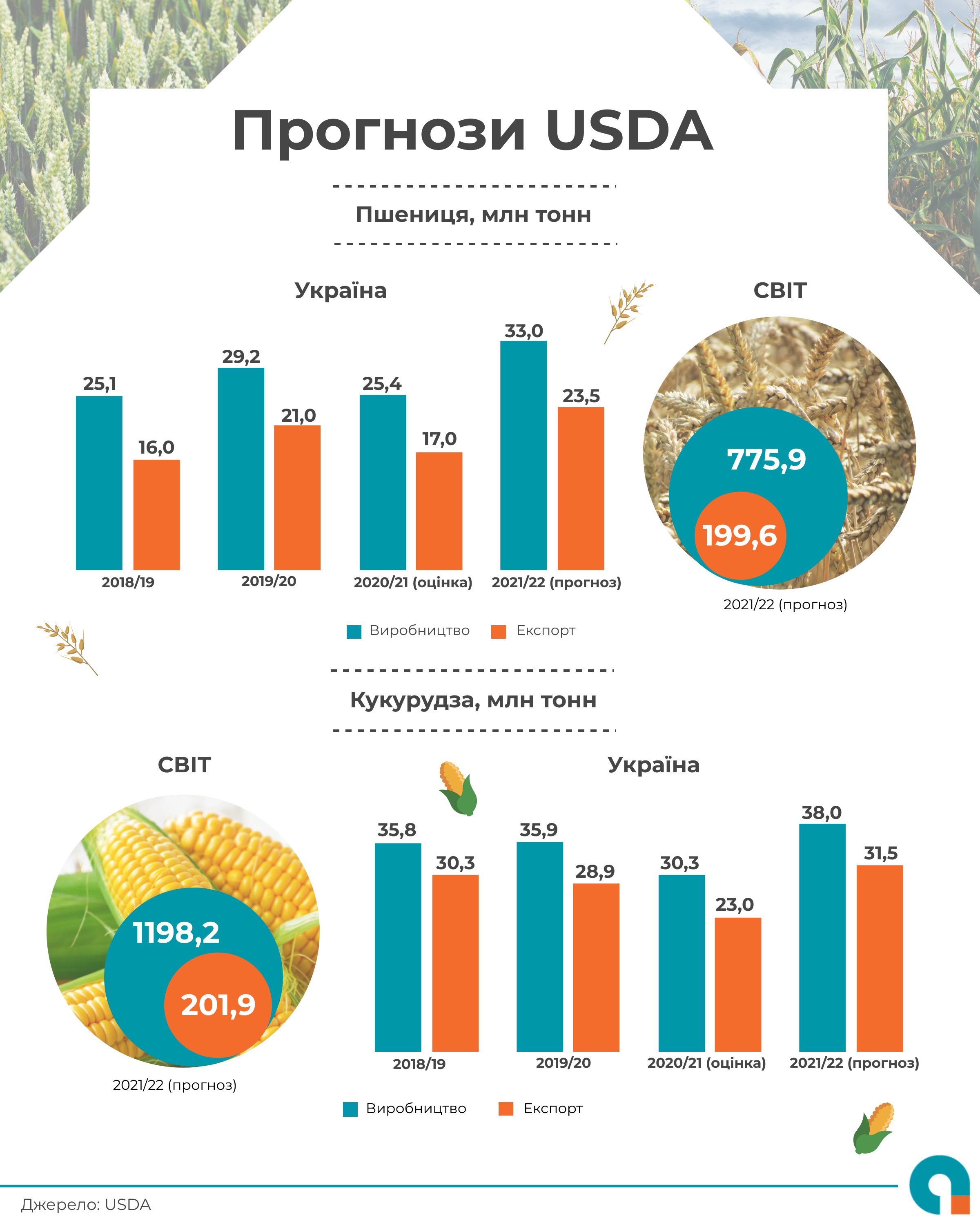 Згідно оновлених прогнозів USDA, в 2021/22 МР показники України щодо пшениці залишаться без змін на максимальних значеннях: виробництво пшениці очікується на рівні 33 млн т, а її експорт – 23,5 млн т. При цьому обсяги виробництва та експорту кукурудзи зменшуються: виробництво на 1 млн т до 38 млн т, а експорт – на 0,5 млн т до 31,5 млн т.