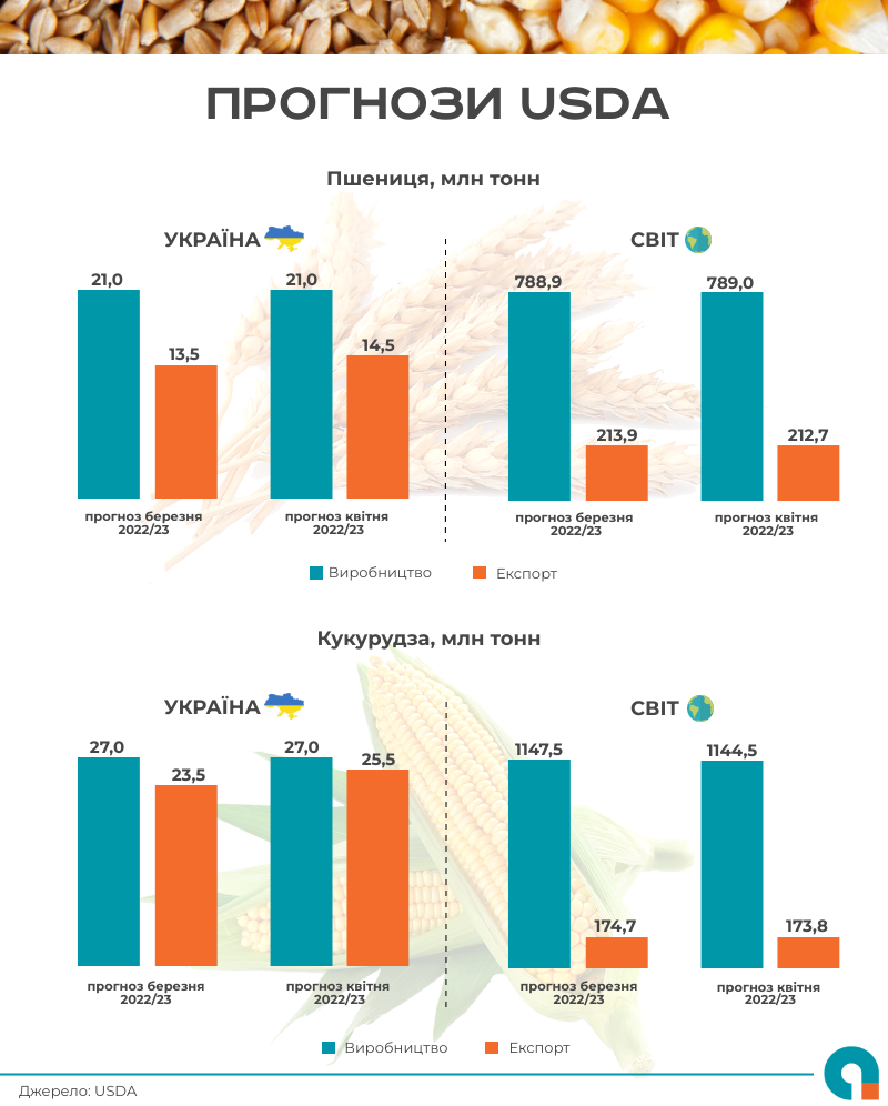 11 квітня 2023 року Департамент сільського господарства США (USDA) оновив світовий прогноз балансу основних сільськогосподарських культур на 2022/23 маркетинговий рік.