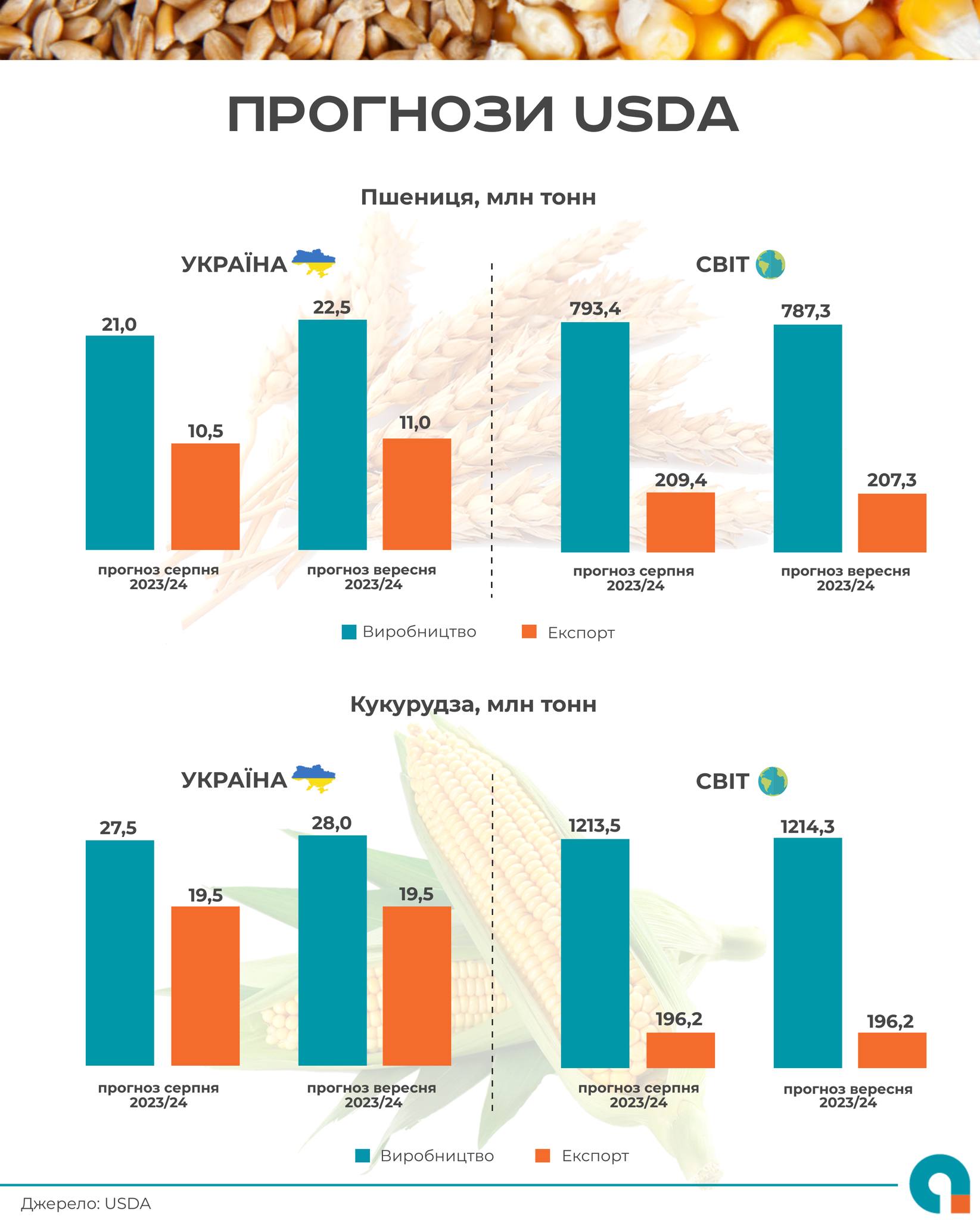 Згідно оновлених прогнозів USDA, в 2023/24 МР показники України щодо виробництва пшениці та кукурудзи збільшилися: пшениці на 1,5 млн т до 22,5 млн т, а кукурудзи – на 0,5 млн т до 28,0 млн т. При цьому, також зросли прогнози обсягів експорту пшениці на 0,5 млн т до 11,0 млн т. Прогноз щодо експорту кукурудзи залишиться без змін – 19,5 млн т.