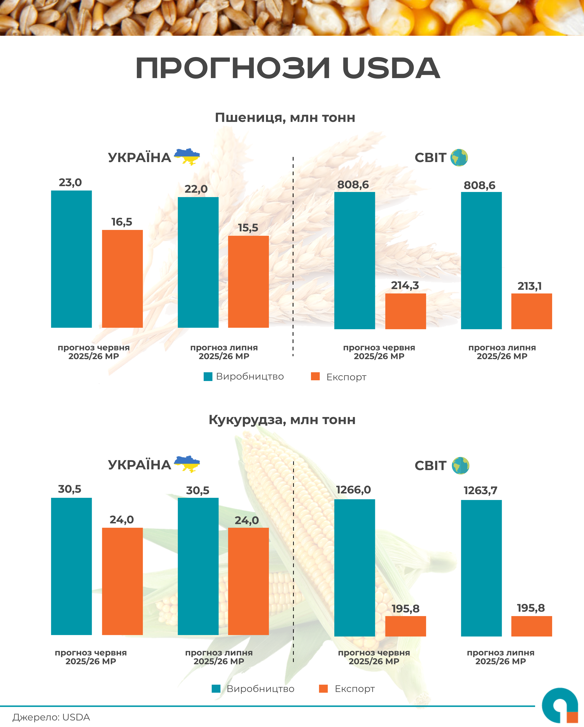 11 липня 2025 року Департамент сільського господарства США (USDA) опублікував світовий прогноз балансу основних сільськогосподарських культур на 2025/26 маркетинговий рік.