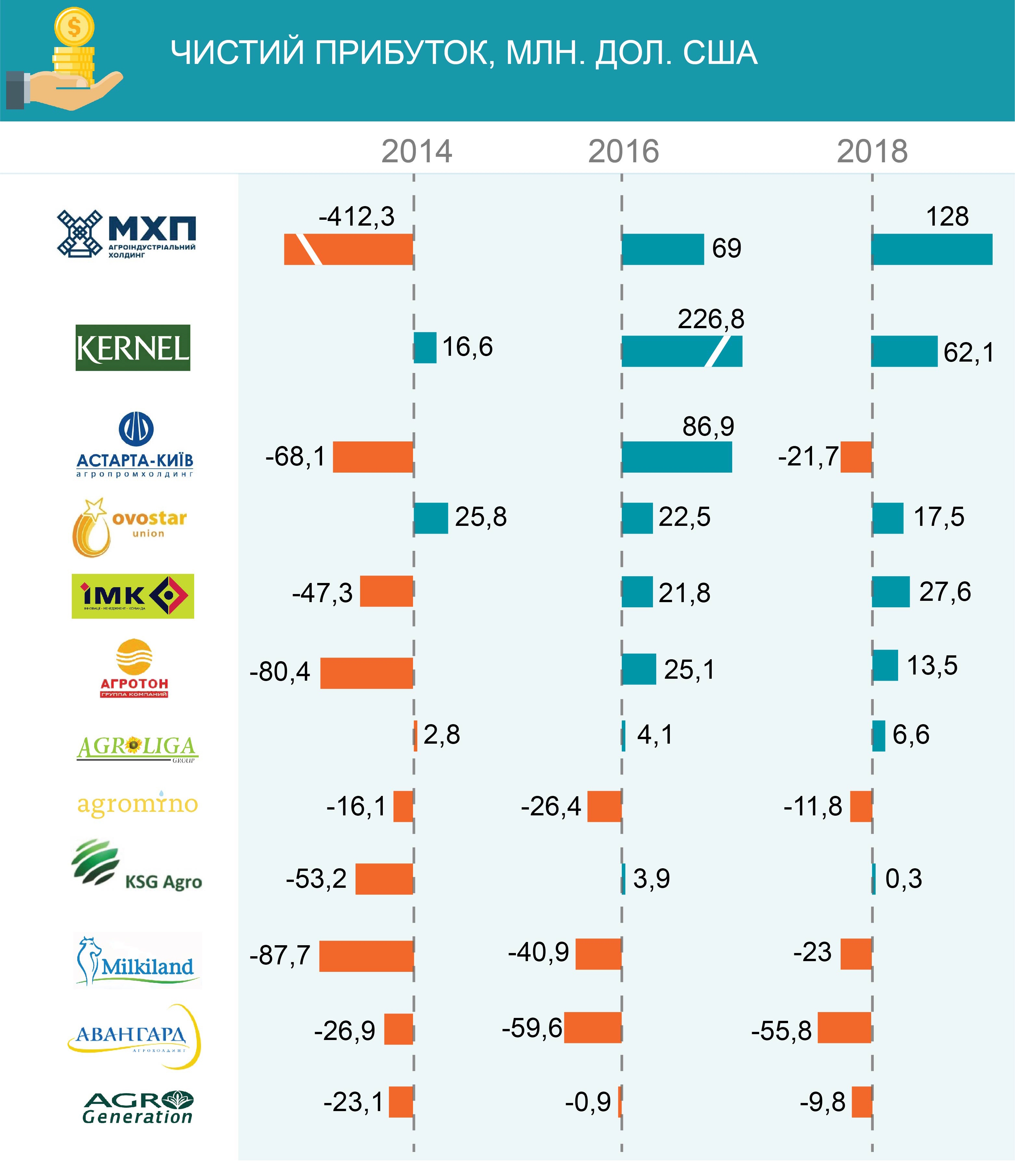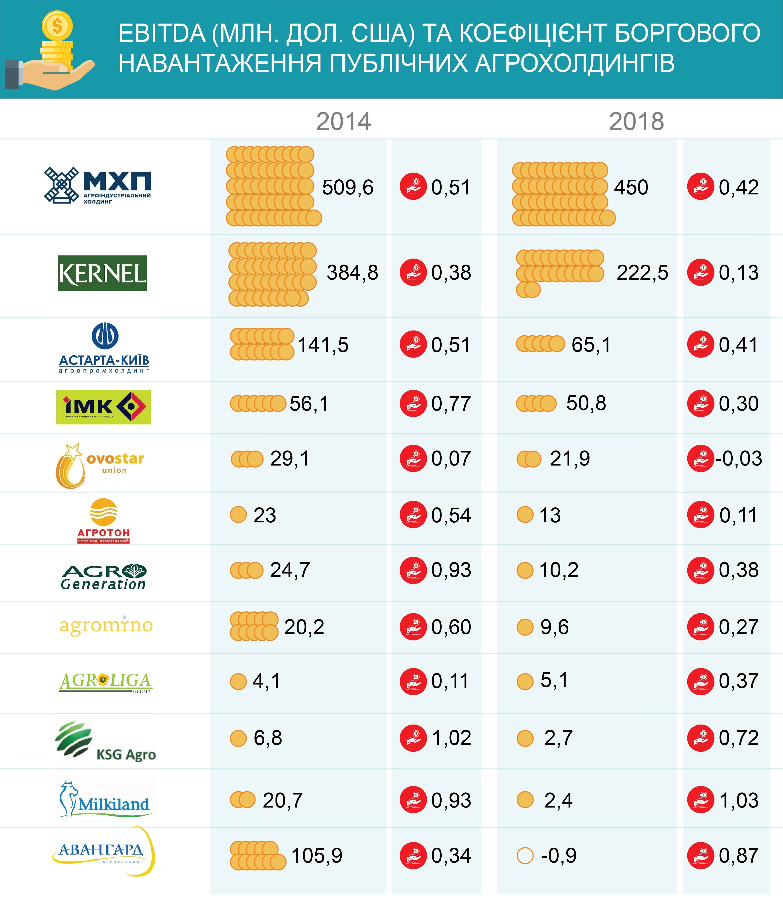 Якщо ж дивитися на основні фінансові показники, то не дуже вдалим був минулий рік і для більшості публічних аграрних холдингів України (ті компанії, які торгуються на фондових біржах; таких дванадцять наразі). Лише декільком публічним компаніям вдалося покращити своє становище за минулий рік. Так, збільшити EBITDA у порівнянні з 2017 роком вдалося лише 4 публічним агрохолдингам: IMC, AgroGeneration, Agroton та Agromino.