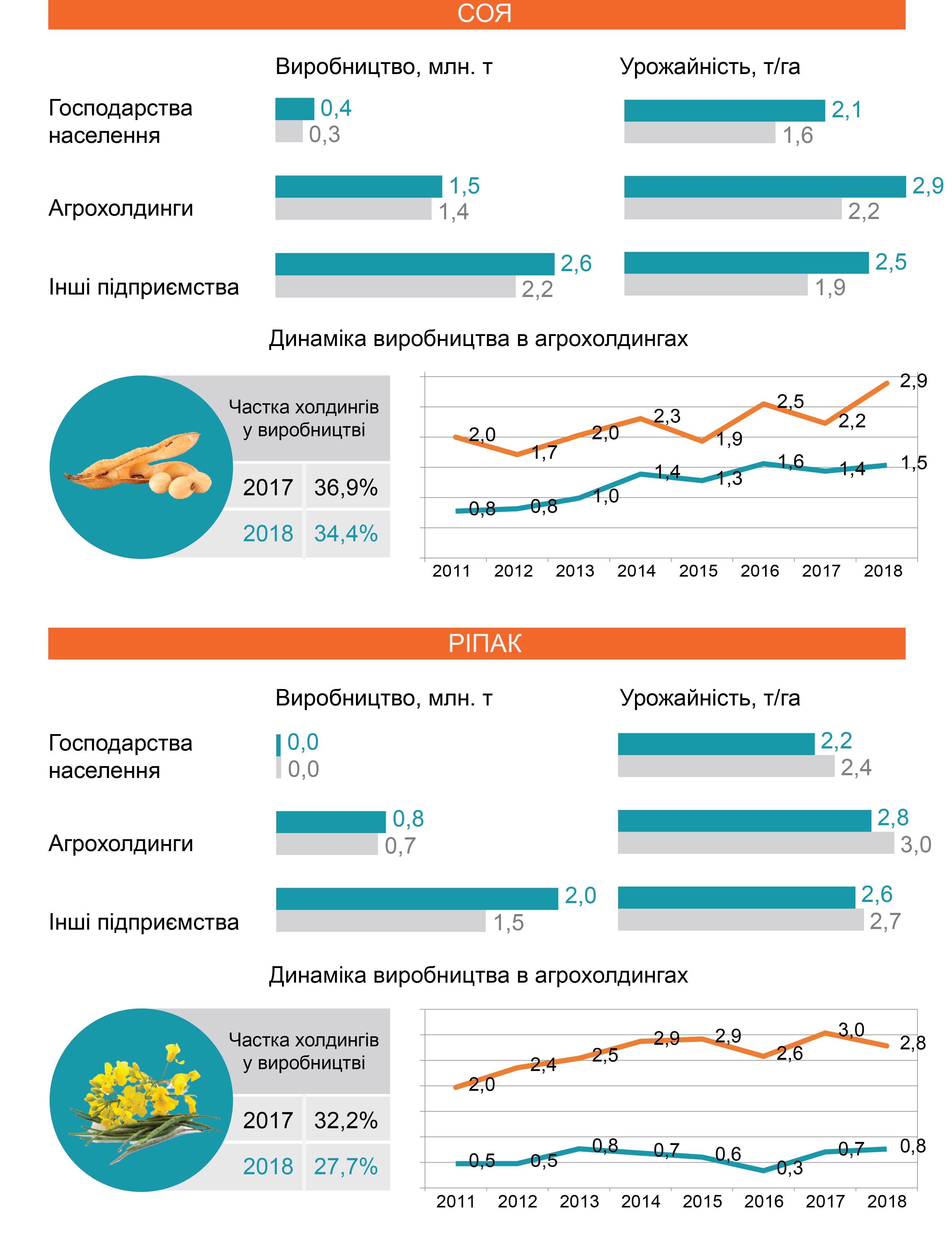 За 2018 рік в порівнянні до 2017, українські агрохолдинги збільшили валове виробництво основних олійних культур: соняшнику (на 400 тис. т. більше), сої (на 100 тис. т. більше) та ріпаку (на 56 тис. т більше). Зростання відбулося за рахунок скорочення посівних площ під окремими зерновими, а також за рахунок високої урожайності, яка продовжує зростати. Агрохолдинги у 2018 році виробили менше пшениці (на 877 тис. т. менше) та ячменю (на 83 тис. т. менше), проте значно наростили виробництво кукурудзи (на 3,9 млн т. більше).