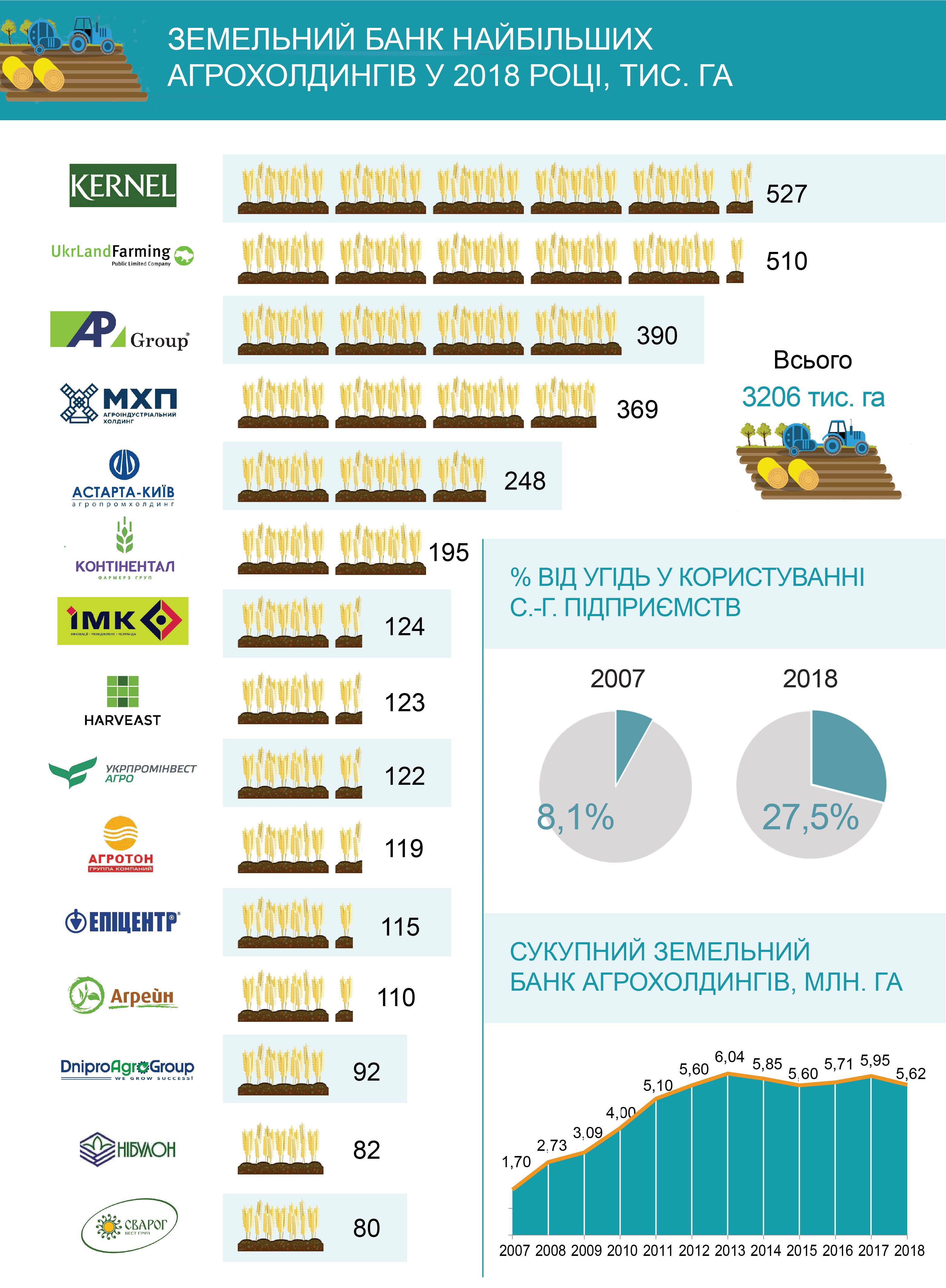 На противагу загальним очікуванням, кількість аграрних холдингів в Україні не збільшується, а зменшується, як і земельний банк, який ними обробляється, – з 5,95 млн га у 2017 до 5,62 млн га у 2018.