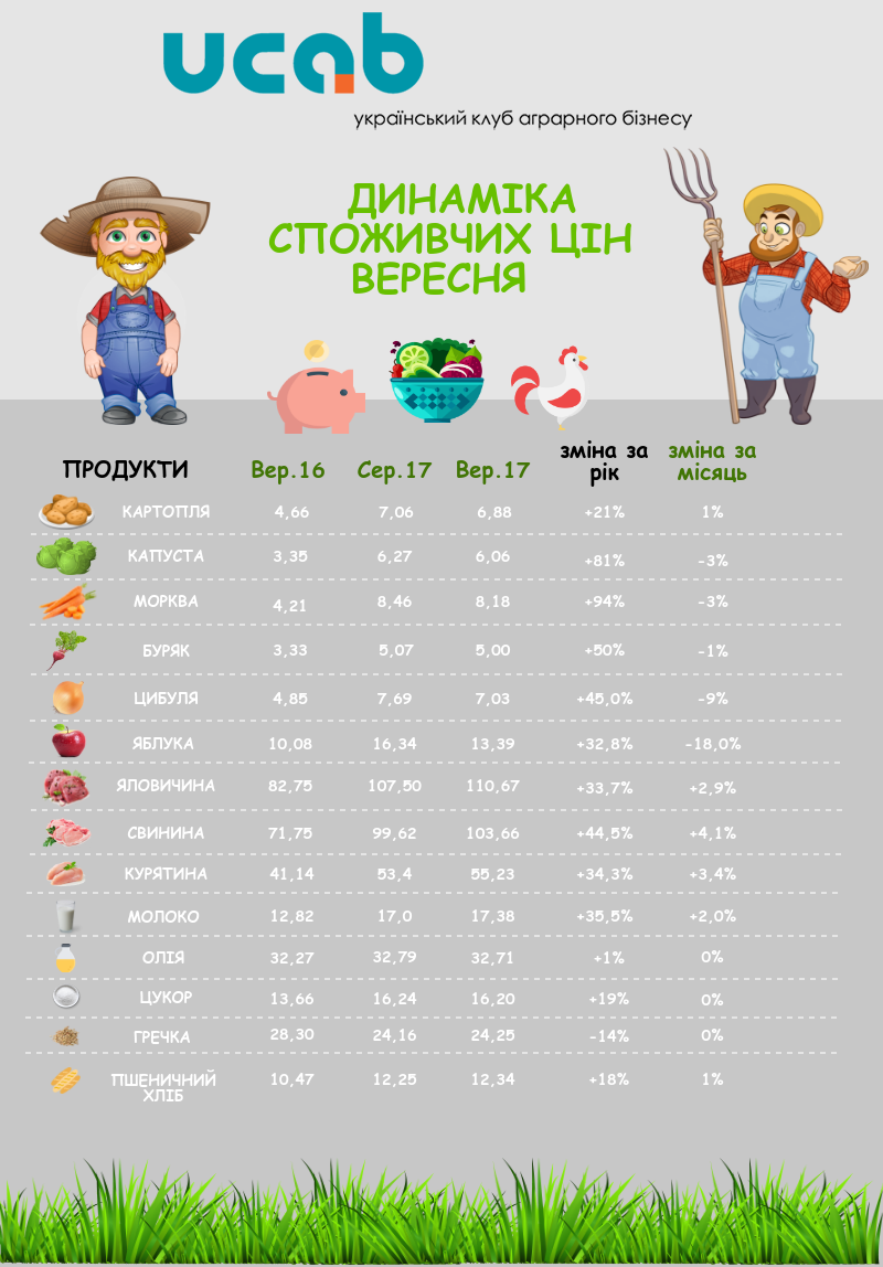 Вартість овочів у вересні, як і прогнозувалось, демонструвала низхідний ціновий тренд. Найбільше подешевшала цибуля (-9%), в той час як картопля та буряк зазнали лише незначного зниження в 1%. Збільшення пропозиції яблук призвело до зниження ціни в розмірі 18%. М'ясо та молоко очікувано прибавили у вартості від 2% до 4%. Група бакалійних продуктів лишилася без змін.