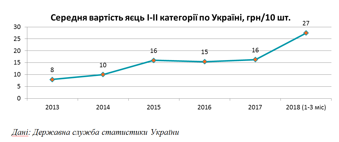 У березні 2018 року вартість десятка яєць зросла у порівнянні з аналогічним періодом 2013 року майже в 6 разів — з 5 до 27 грн/10 шт. Суттєве зростання цін на яйця почалося з серпня 2017 року, коли вартість збільшилася з 10 грн у липні до 14,5 грн/10 шт у серпні.