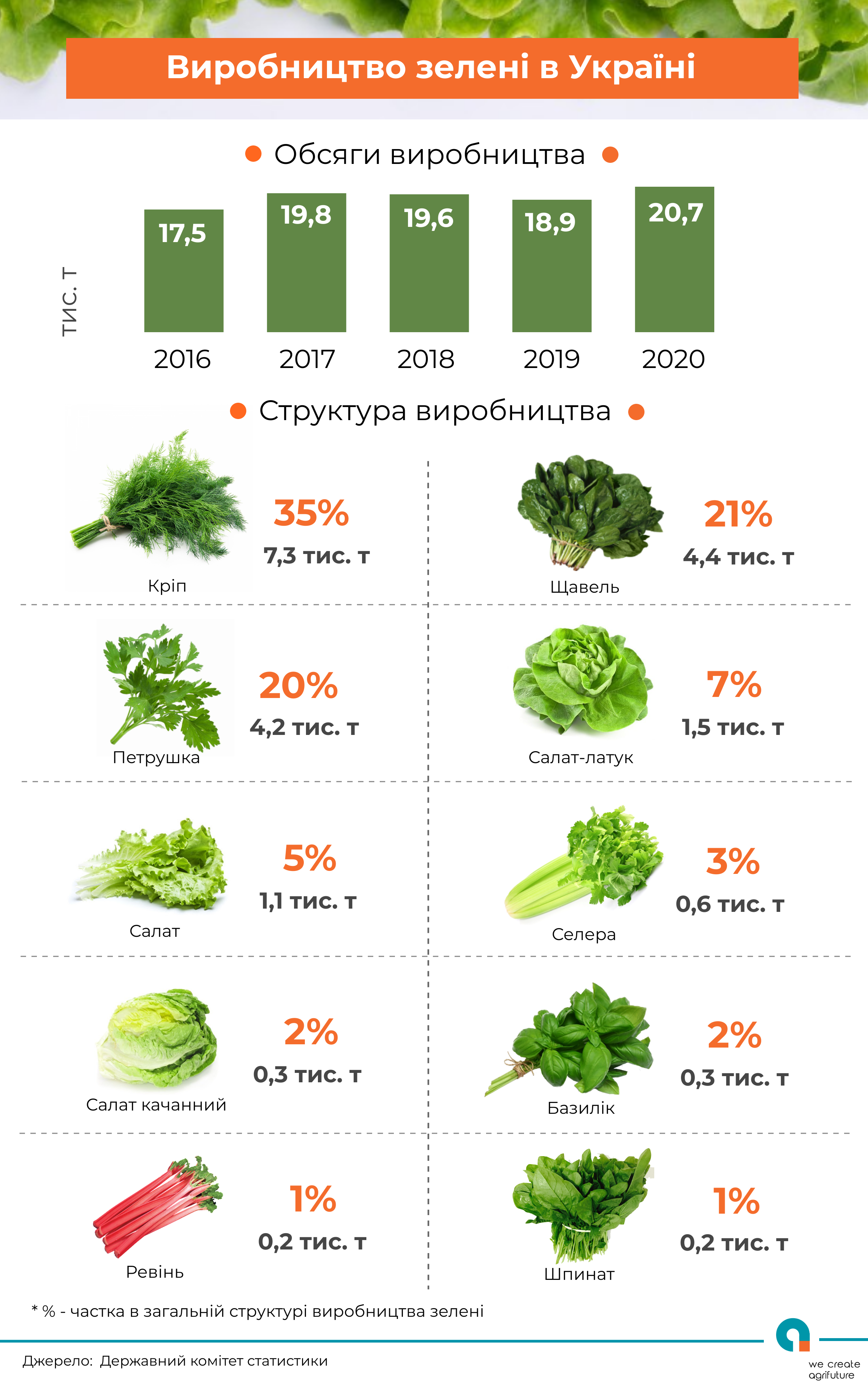 В 2020 році було вирощено 20,7 тис. т зелені різних видів, що на 9% вище показника минулого року та на 18% показника п’ятирічної давнини.