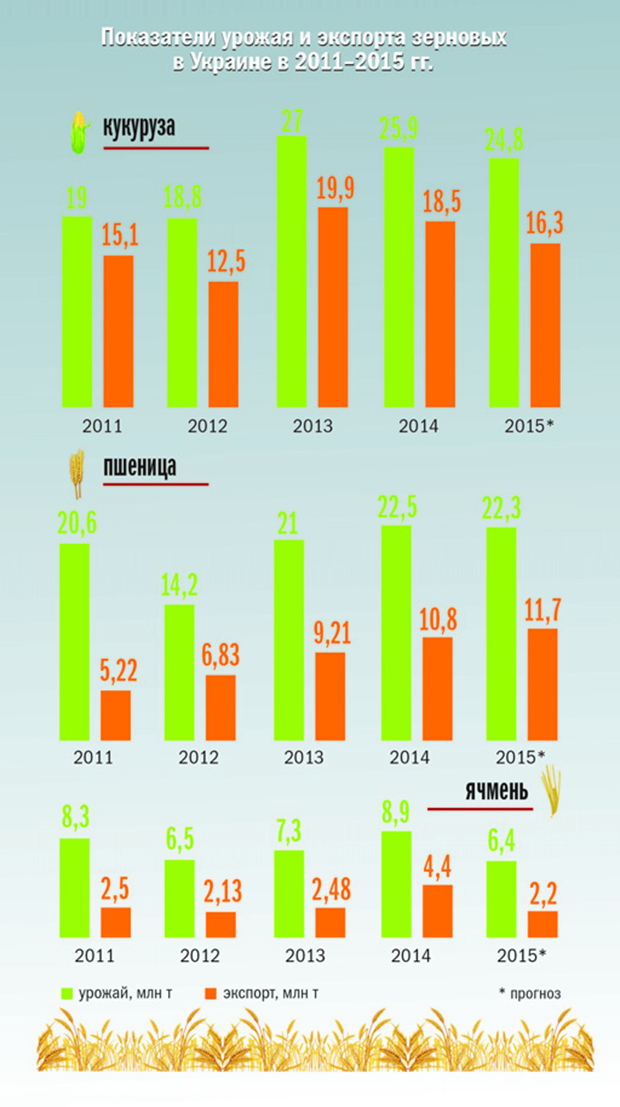 В прошлом году Украина собрала рекордный урожай зерна. По данным Госстата, даже без учета аннексированного Крыма и оккупированной части Донбасса аграрии вырастили 63,9 млн т зерновых и зернобобовых. При этом сбор основных культур - пшеницы, ячменя и кукурузы - составил почти 60 млн т. Для сравнения: в 2013 г., который также считался вполне благополучным для отечественного аграрного бизнеса, цифры составили 63 млн и 59 млн т соответственно. Высокий зерновой вал позволил нашей стране активно наращивать экспорт. По состоянию на 12 июня трейдеры поставили на внешние рынки 33,1 млн т зерна, а с учетом уже подготовленного к экспорту - 33,3 млн т (из них пшеницы 10,6 млн, кукурузы - 17,8 млн, ячменя - 4,4 млн т). Для сравнения: в минувшем маркетинговом году экспорт едва превысил 32 млн т.