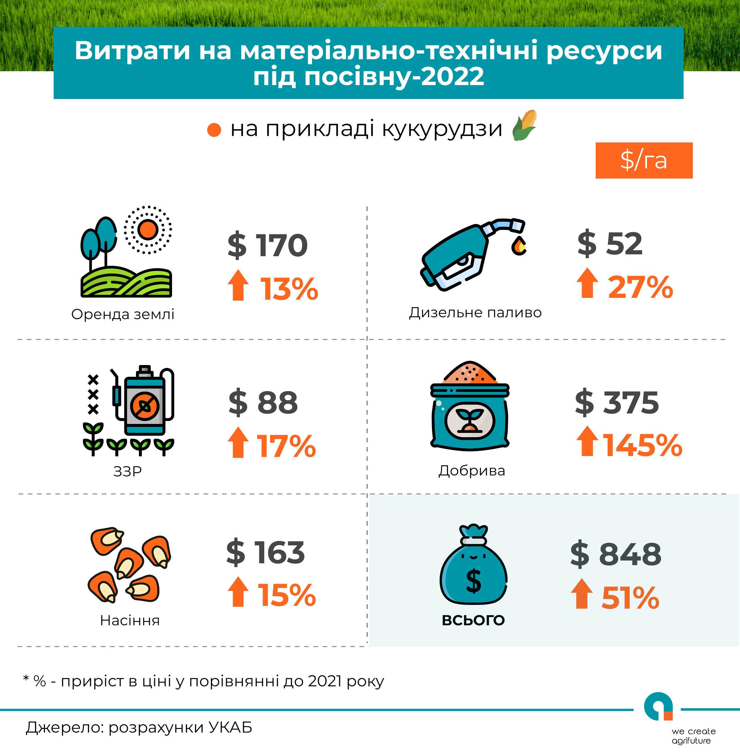 Аналітики асоціації «Український клуб аграрного бізнесу» (УКАБ) зазначають, що найбільше подорожчали мінеральні добрива. Ціни на них зросли в середньому в 2,5 рази в порівнянні з попередньою посівною кампанією, що зумовлено стрімким збільшенням вартості природного газу — основної складової виробництва азотних добрив. Експерти наголошують: слід врахувати, що це ще не пік сезону, коли ціна може знову збільшитися через підвищений попит.