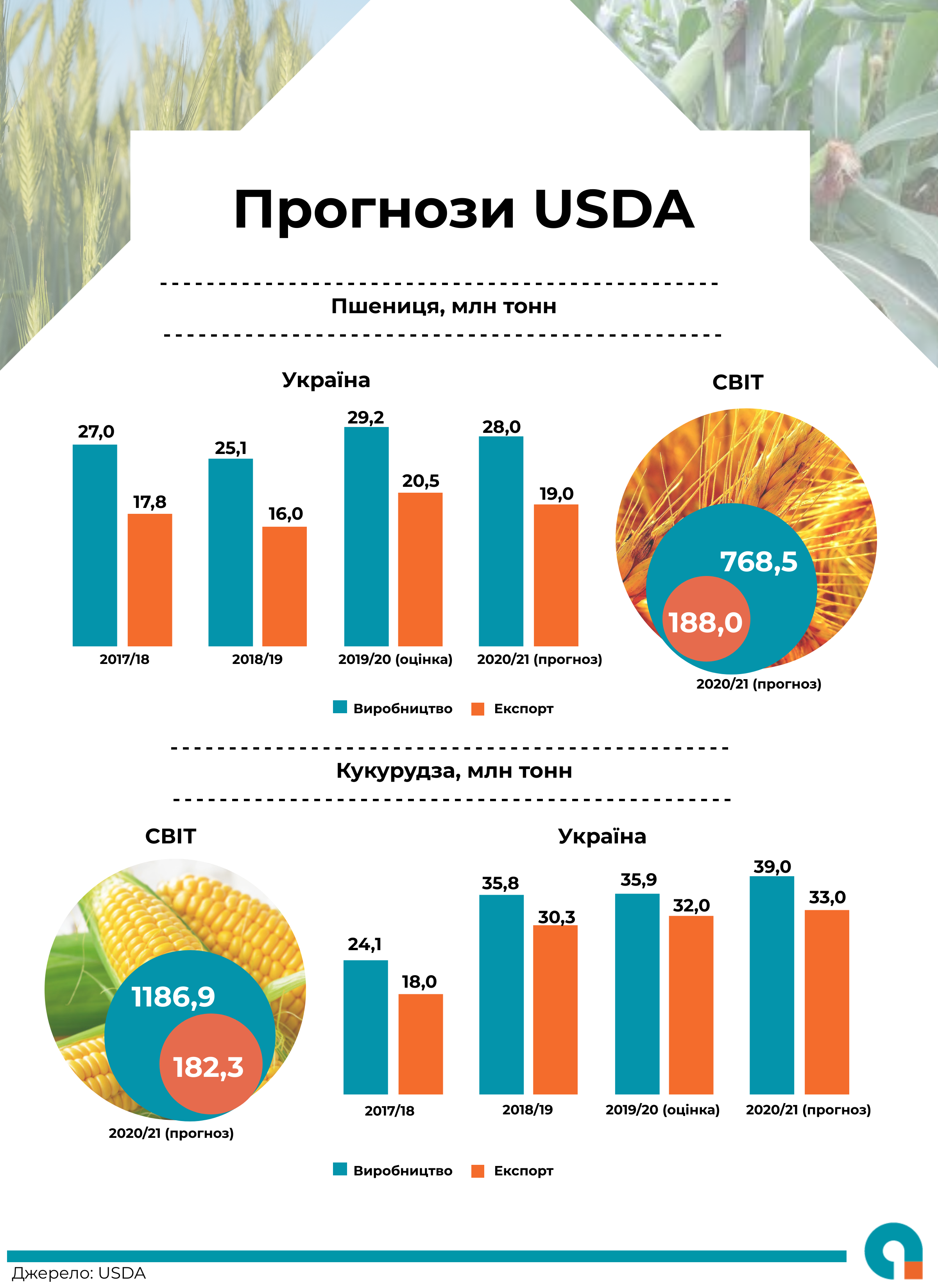 В Україні Міністерство сільського господарства США прогнозує виробництво 77,85 млн т зернових в Україні 2020/21 маркетингового року (МР), з них 28 млн т пшениці та 39 млн т кукурудзи. Так, внаслідок зміни структури посівних площ , врожай прогнозується на 2,13 млн т (+3 %) більшим порівняно з поточним 2019/20 МР, в першу чергу за рахунок збільшення на 3,30 млн тонн виробництва кукурудзи, попри скорочення на 1,17 млн тонн врожаю пшениці.